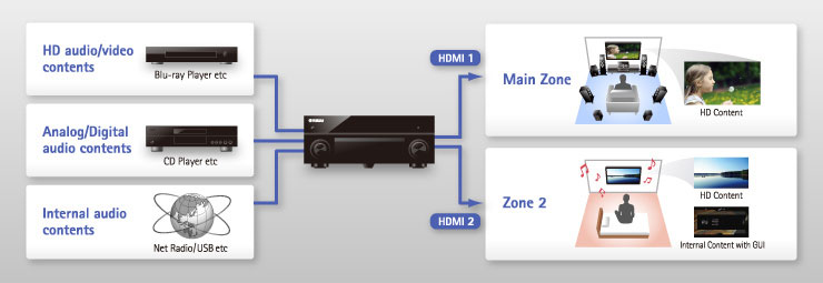 While standard HDMI zone switching can only send HD video programs to the main and second zones, advanced HDMI® zone switching from Yamaha adds the capability to choose from all audio and video sources for playback in Zone 2*. An on-screen graphical user interface makes it easy to browse and select content to enjoy from the second zone no matter what is being played in the Main Zone.
