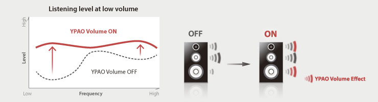 Human ears have less sensitivity to high and low frequencies, especially at lower volumes. YPAO Volume applies loudness EQ correction to automatically adjust high and low frequency levels as the volume changes. Using the YPAO measurement results, EQ correction is optimized to your system settings and listening environment.