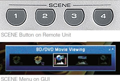 The SCENE PLUS function simplifies operation by providing one touch power-on along with selection of the desired source and the appropriate DSP programs. SCENE PLUS offers a choice of 12 SCENE selections, four of which can be assigned to the second zone in a multi-zone system. SCENE PLUS can be selected from the front panel, remote control, GUI and even from the AV Controller App.