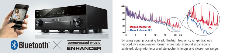 The RX-A2050 is equipped with Bluetooth® functionality to let you easily enjoy wireless music playback from smartphones and other devices. The Compressed Music Enhancer from Yamaha is now optimized for Bluetooth audio transmissions to ensure that your music will have vivid, lively sound quality during wireless playback.