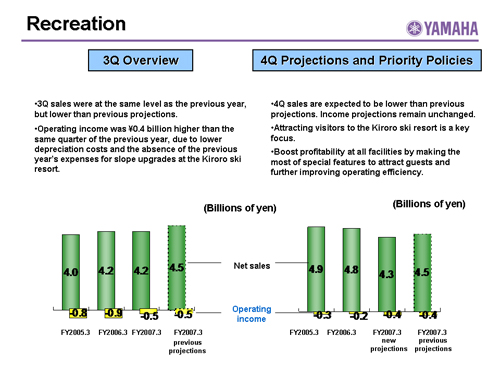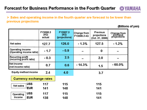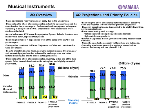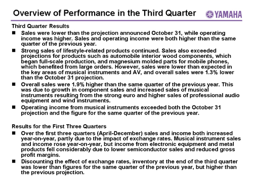 In this report, the divs forecast for the Company's future performance have been calculated on the basis of information currently available to Yamaha and the Yamaha Group. Forecasts are, therefore, subject to risks and uncertainties. Accordingly, actual performance may differ greatly from our predictions depending on changes in operating and economic conditions, demand trends, and the value of key currencies, such as the U.S. dollar and the euro.