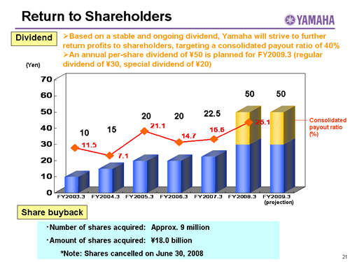 In this report, the divs forecast for the Company's future performance have been calculated on the basis of information currently available to Yamaha and the Yamaha Group. Forecasts are, therefore, subject to risks and uncertainties. Accordingly, actual performance may differ greatly from our predictions depending on changes in operating and economic conditions, demand trends, and the value of key currencies, such as the U.S. dollar and the euro.
