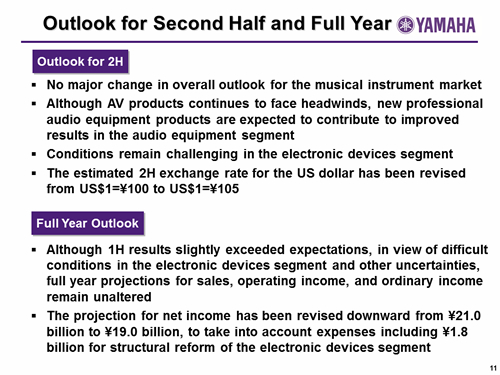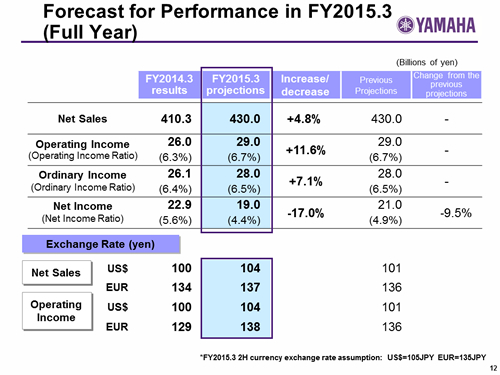 In this report, the divs forecast for the Company's future performance have been calculated on the basis of information currently available to Yamaha and the Yamaha Group. Forecasts are, therefore, subject to risks and uncertainties. Accordingly, actual performance may differ greatly from our predictions depending on changes in operating and economic conditions, demand trends, and the value of key currencies, such as the U.S. dollar and the euro.