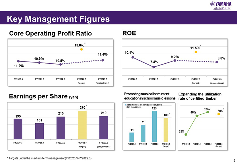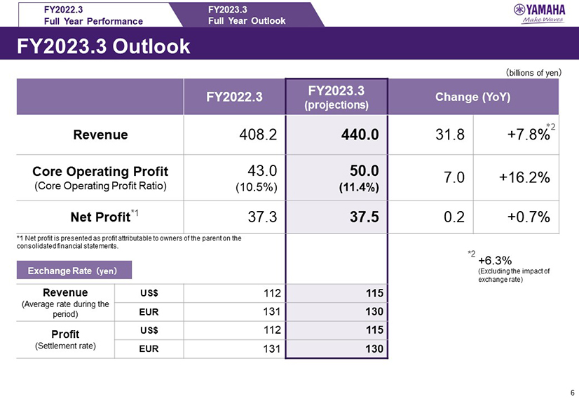 In this report, the divs forecast for the Company's future performance have been calculated on the basis of information currently available to Yamaha and the Yamaha Group. Forecasts are, therefore, subject to risks and uncertainties. Accordingly, actual performance may differ greatly from our predictions depending on changes in operating and economic conditions, demand trends, and the value of key currencies, such as the U.S. dollar and the euro.