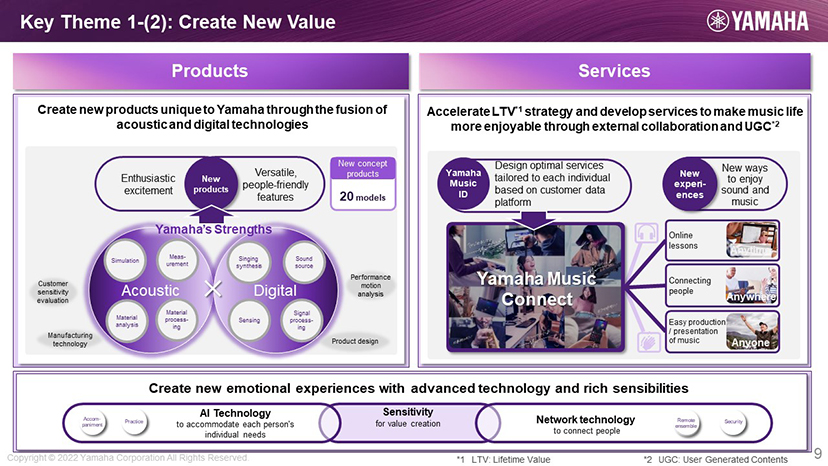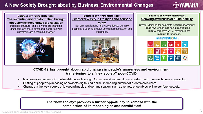 In this report, the divs forecast for the Company's future performance have been calculated on the basis of information currently available to Yamaha and the Yamaha Group. Forecasts are, therefore, subject to risks and uncertainties. Accordingly, actual performance may differ greatly from our predictions depending on changes in operating and economic conditions, demand trends, and the value of key currencies, such as the U.S. dollar and the euro.