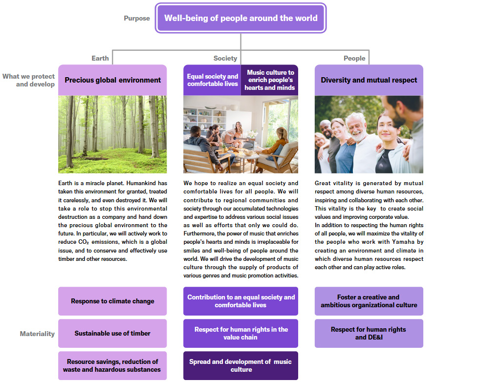 The Yamaha Group aims to create a society that realizes the well-being of all people around the world. To achieve this goal, we will work to protect our one precious earth and contribute to the development of an equal society, comfortable lives, and a music culture that enriches people's hearts and minds, with our corporate philosophy of "Yamaha Philosophy" as the foundation to draw from. At the same time, we will not only respect for human rights but also create an environment in which diverse human resources can respect each other and actively play a role. Through these initiatives, we will continue to create excitement and cultural inspiration together with people around the world.
