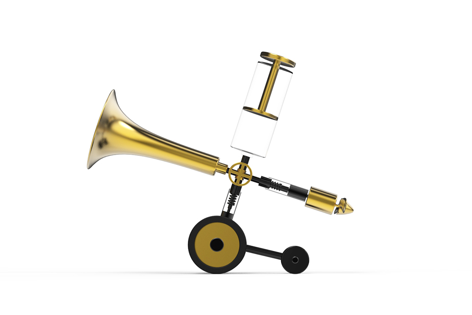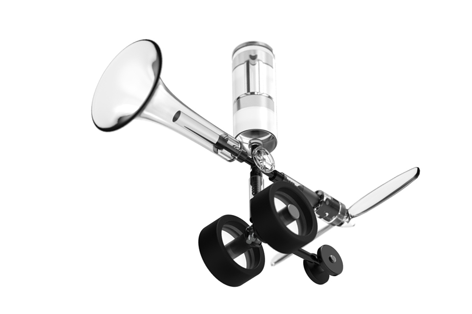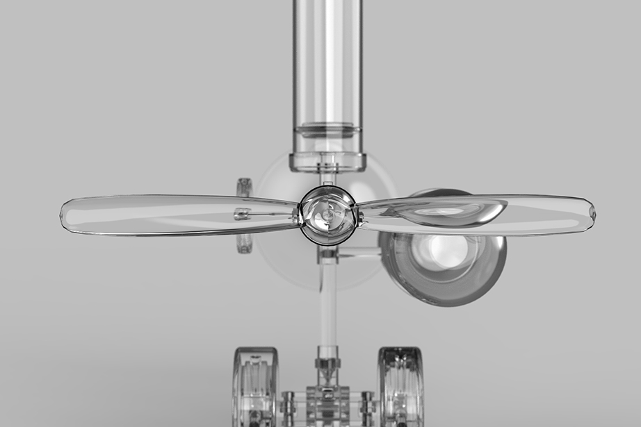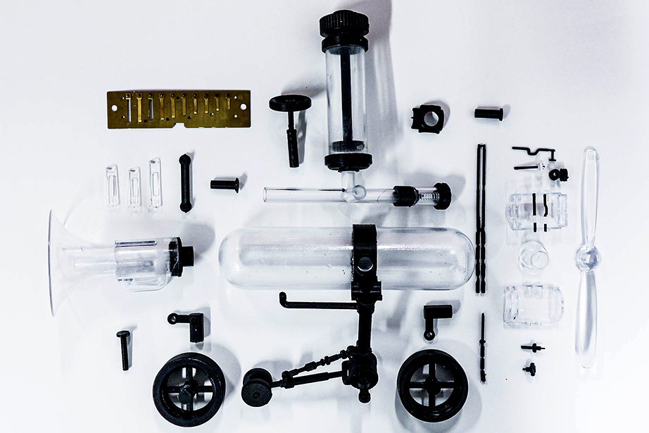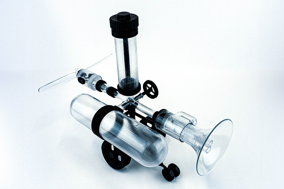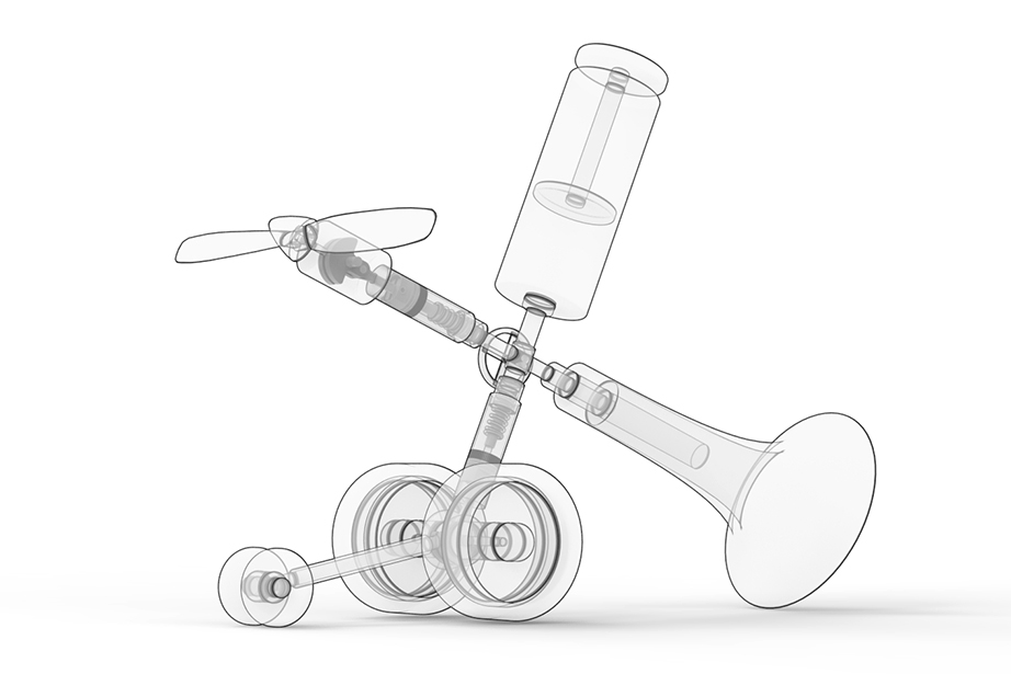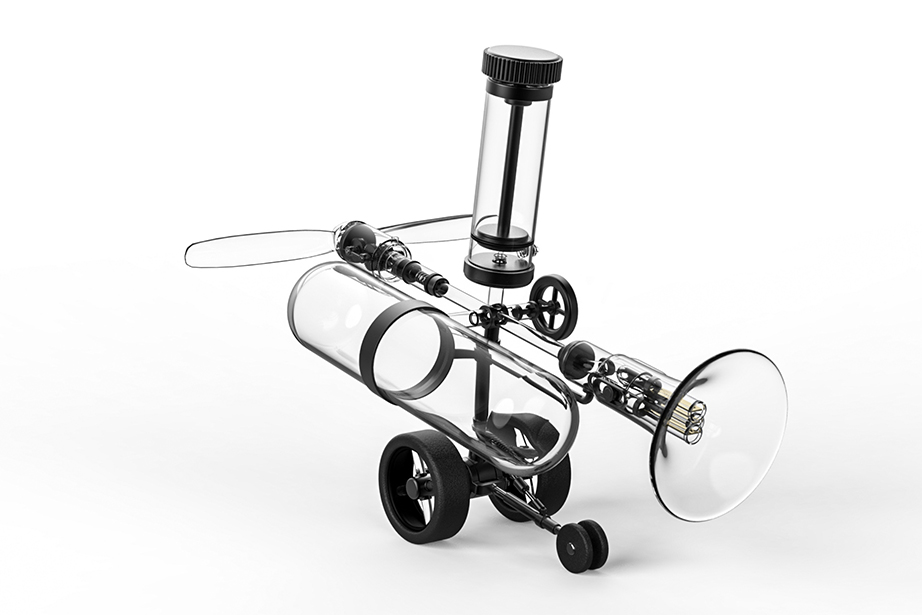 To use it, first push the air pump attached to the upper side of the main unit several times to accumulate air in the air tank located on the side. Then, by twisting the valve in the center of the main unit and opening the air passage of the transparent tube in a certain direction, air is immediately released from the compression tank in the direction where the valve is opened. The released air pressure is used to generate sound as the air flowing into the trumpet-shaped tube is used to generate energy to vibrate the harmonica reeds attached to the inside of the trumpet. The air flowing into the other tube, to which the propeller is attached, is converted into the reciprocating motion of the piston, which rotates the crank and produces propulsive force.