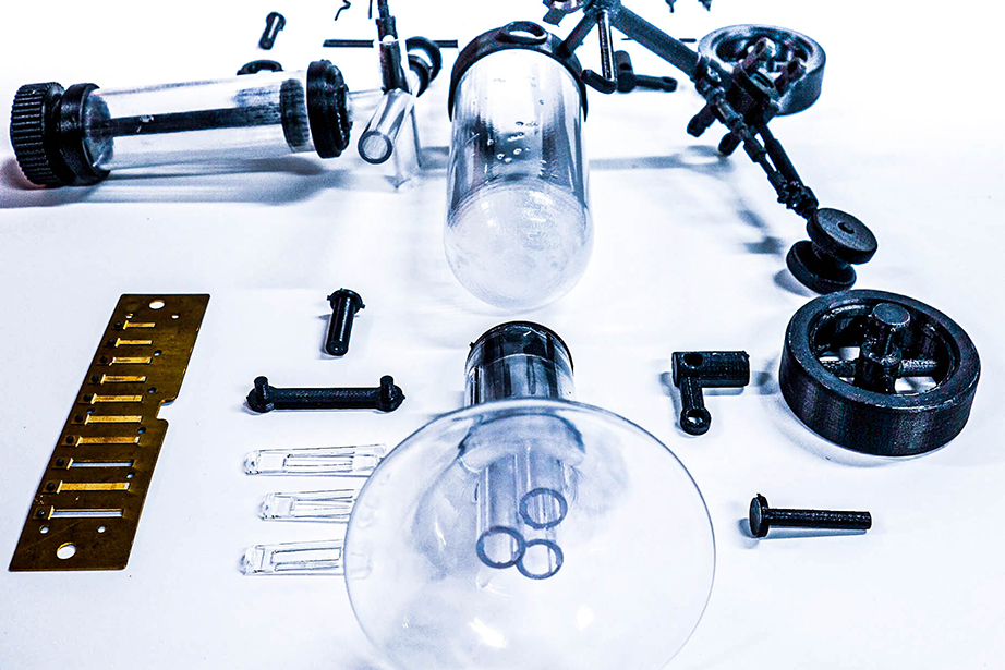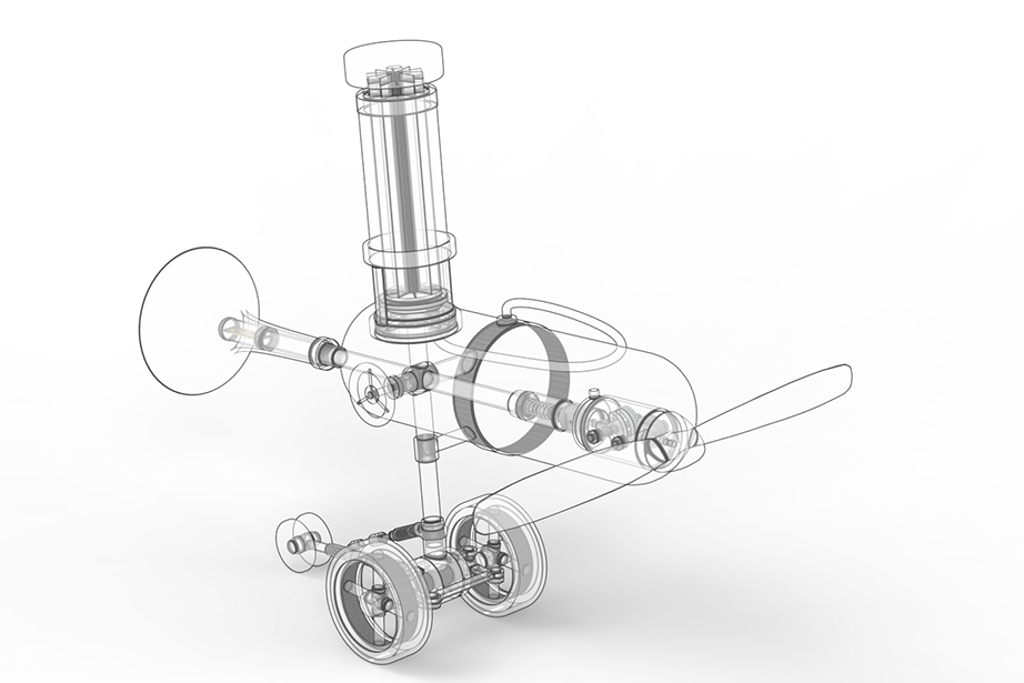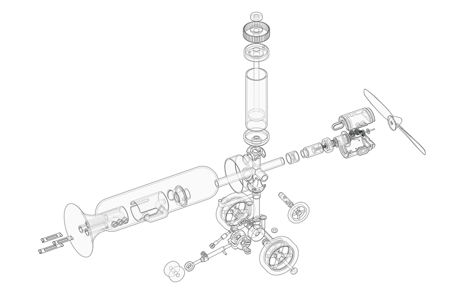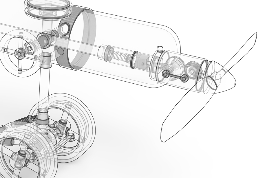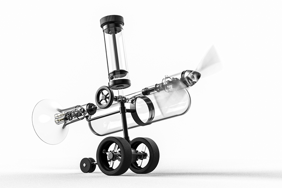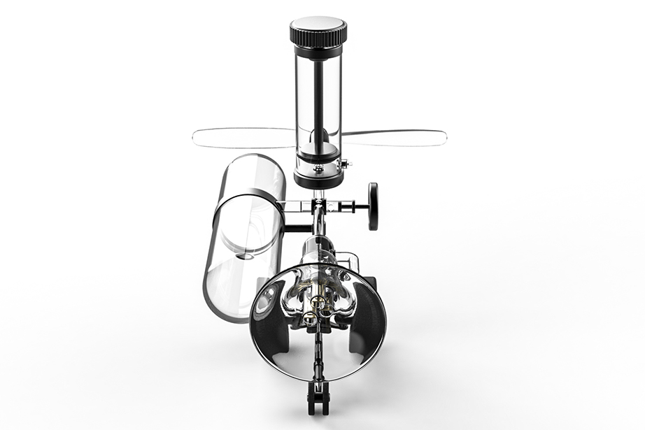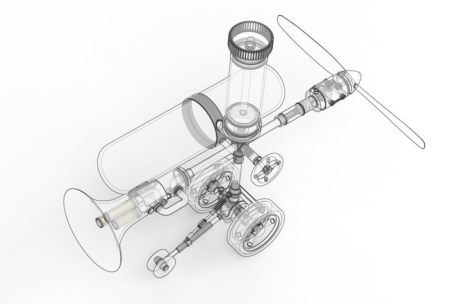 To use it, first push the air pump attached to the upper side of the main unit several times to accumulate air in the air tank located on the side. Then, by twisting the valve in the center of the main unit and opening the air passage of the transparent tube in a certain direction, air is immediately released from the compression tank in the direction where the valve is opened. The released air pressure is used to generate sound as the air flowing into the trumpet-shaped tube is used to generate energy to vibrate the harmonica reeds attached to the inside of the trumpet. The air flowing into the other tube, to which the propeller is attached, is converted into the reciprocating motion of the piston, which rotates the crank and produces propulsive force.