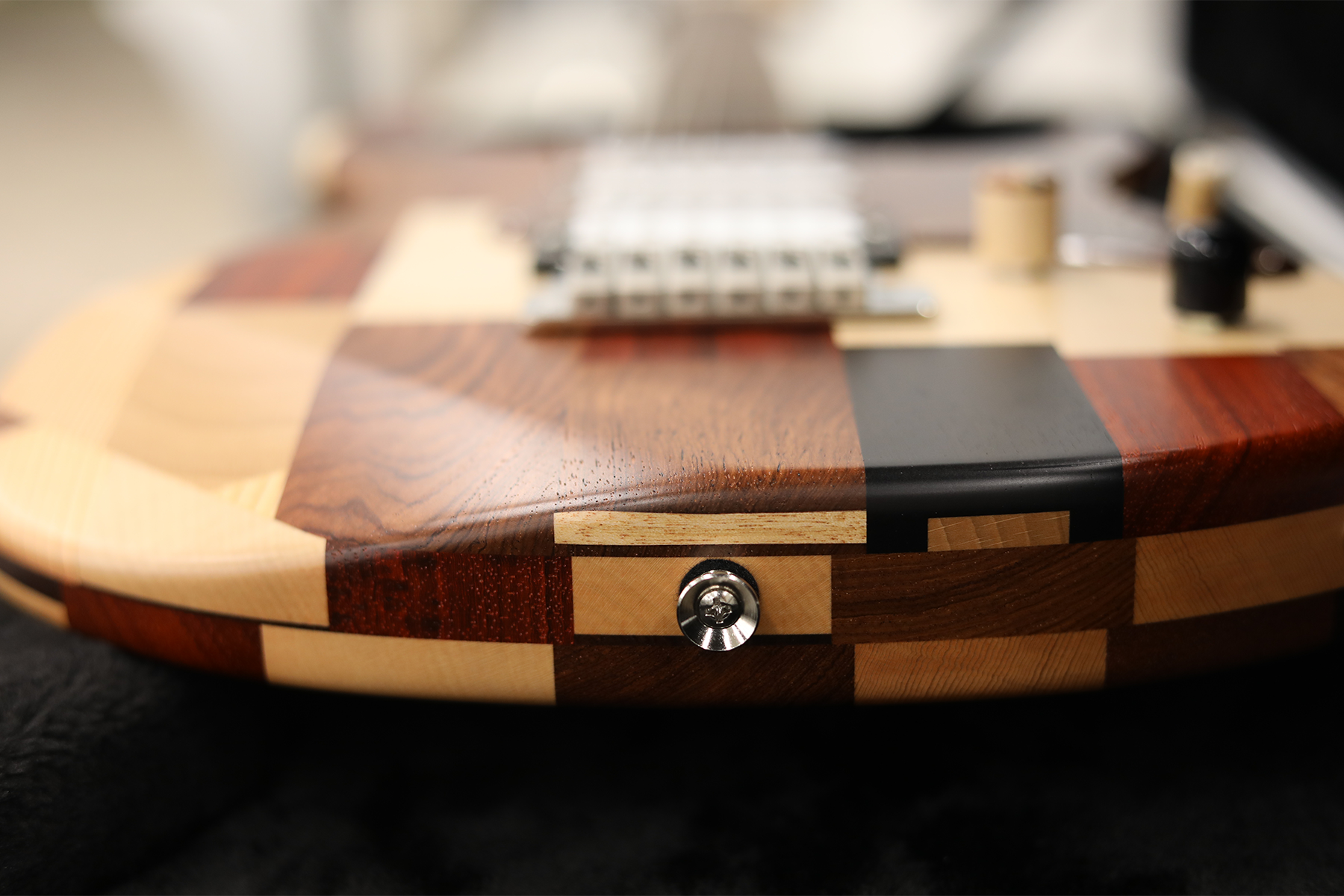 This model utilizes unused materials from marimba bars. The rosewood used is dense, hard, and heavy. Material specifically selected for marimba bars is characterized by excellent sound projection and long sustain. The neck and body are finished using unused marimba bar materials. The body features a solid-body construction without internal voids, and the arrangement of the bar blocks expresses the essence of a marimba. Furthermore, by tilting the wood grain at a 60-degree angle, a natural resonance is achieved even with this highly rigid wood. The characteristic of the sound is the length of sustain inherent in the material.