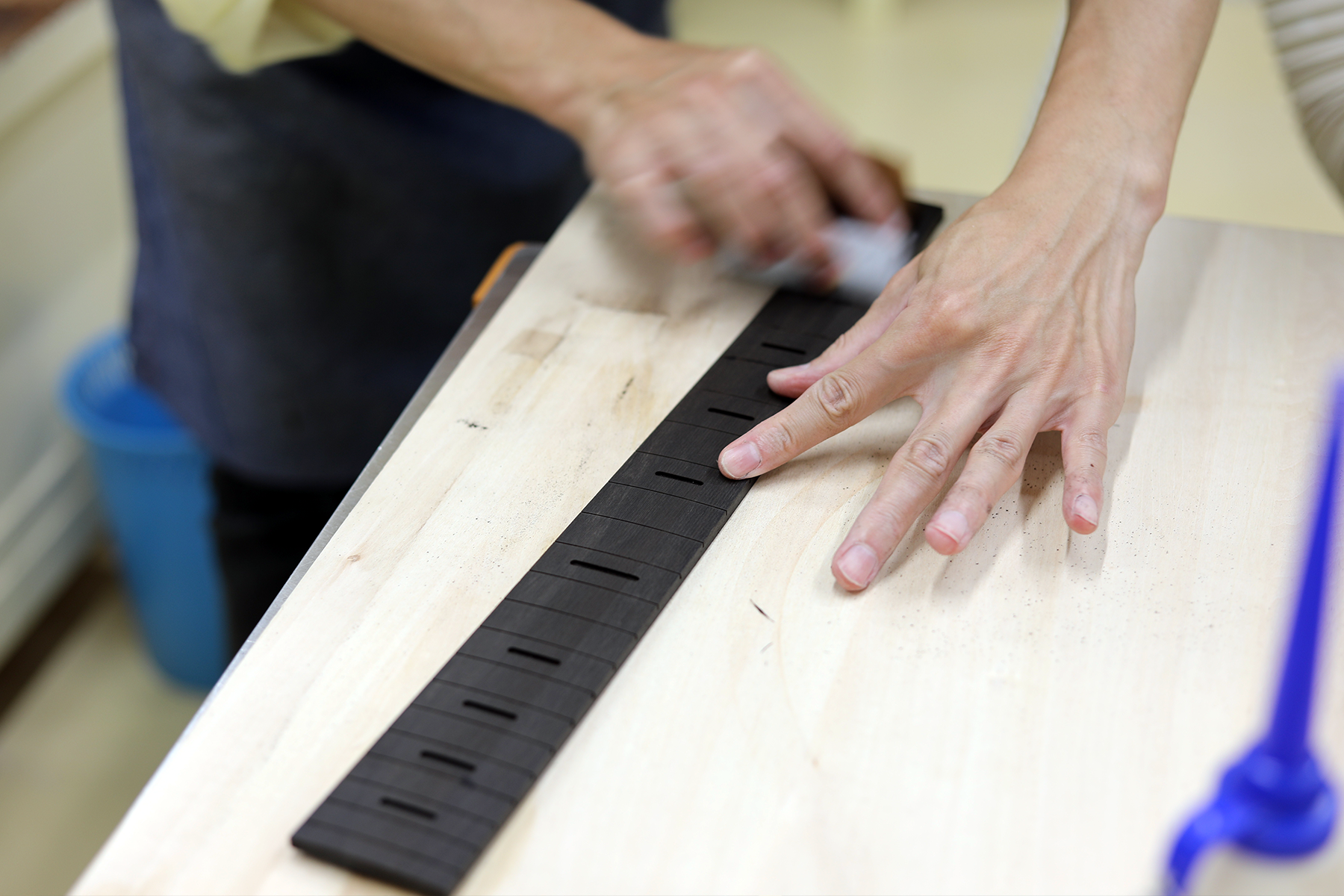 Assembling various types of wood requires extensive knowledge and skills in processing, gluing, and finishing. Yamaha has many woodworking professionals who leveraged their accumulated experience and specialized techniques to achieve this assembly. Furthermore, the brass binding on the “Marimba” model is finished by the brass instrument craftsmen’s hands. The adjustment of the plating color between the “Marimba” and “Piano” models utilizes our brass instrument techniques. By combining these diverse technologies we have cultivated, we were able to create a guitar with a new appeal unique to Yamaha.