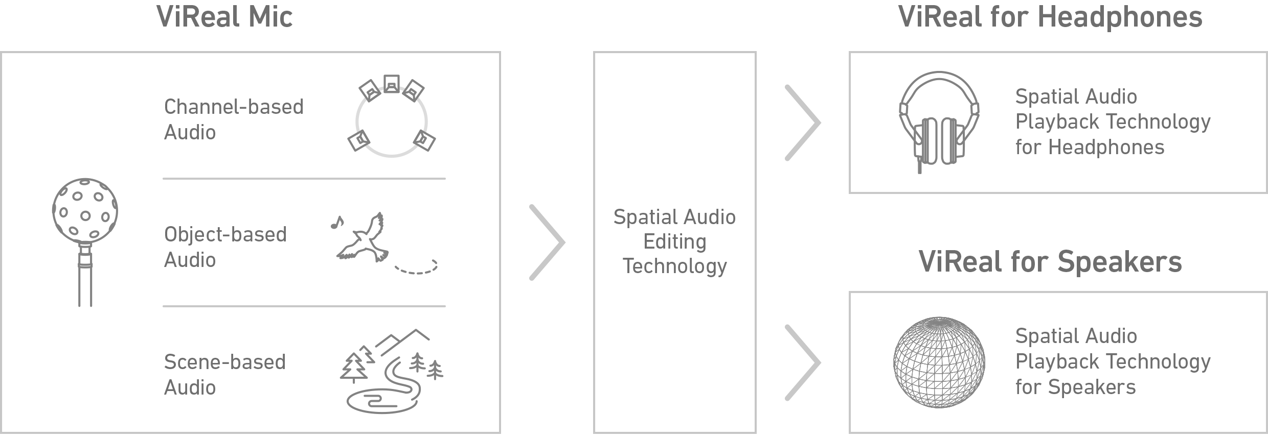 We will introduce ViReal Mic, for capturing spatial audio, ViReal for Headphones, a spatial audio processing technology for headphones, ViReal for Speakers, a spatial audio processing technology for loudspeakers, and ViReal Dome, a large-scale playback system.