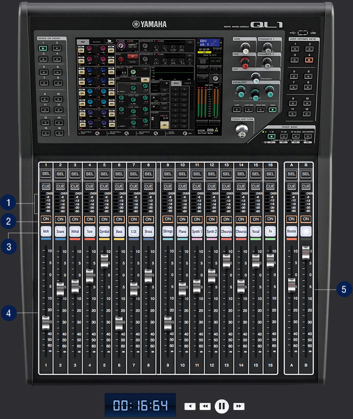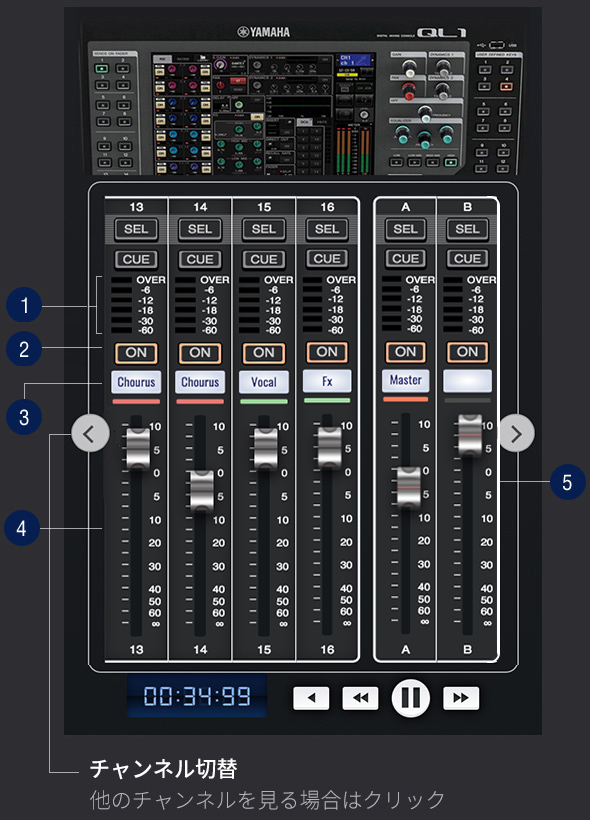 1ch〜16chに割り振られた各チャンネルボタン②で、音源のON/OFFができます。