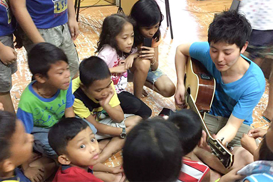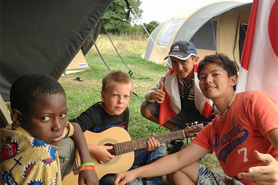 東日本大震災で被害を受けた福島県の楢葉(ならは)町の子どもたちを、フランスのNGOが開催する国際交流キャンプに引率する役目を担いました。紛争、貧困、災害などに苦しむ約25カ国から子どもが集まったこのキャンプに、僕がギターを携えていったところ「本物のギターを見るのは初めて!」と子どもたちが群がってきました。ここでは各国の伝統楽器を交えてセッションをしたり、日本の歌を歌ったりするうちに大きな輪ができます。国や人種、言葉の壁を越えて、みんなで音楽やダンスを楽しむ様子は、僕が想い描いていたシーンそのもの。人と人の心をつなぐ「音楽の求心力」に改めて感動しました。