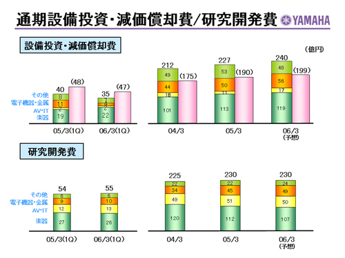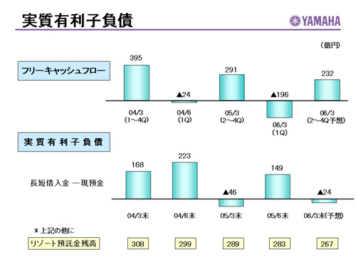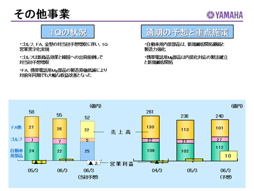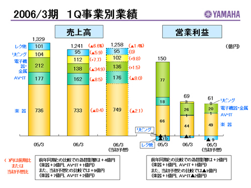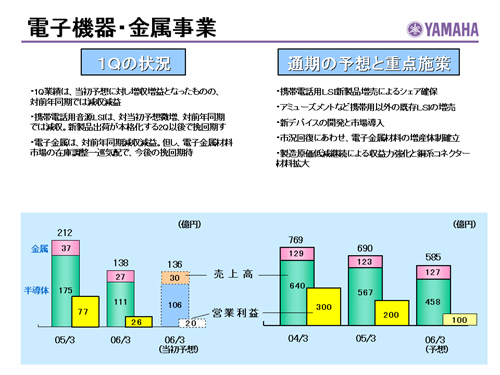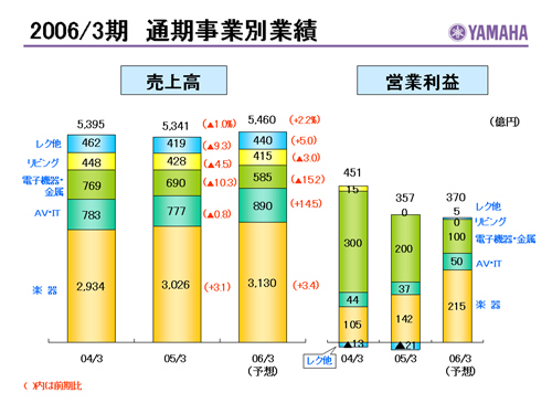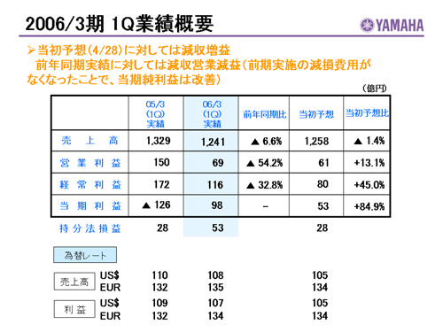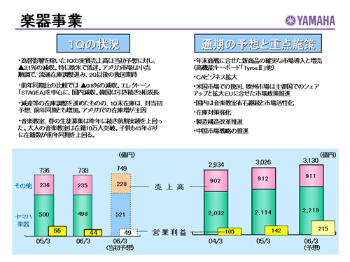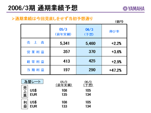 この資料の中で、将来の見通しに関する数値につきましては、ヤマハ及びヤマハグループ各社の現時点での入手可能な情報に基いており、この中にはリスクや不確定な要因も含まれております。従いまして、実際の業績は、事業を取り巻く経済環境、需要動向、米ドル、ユーロを中心とする為替動向等により、これらの業績見通しと大きく異なる可能性があります。