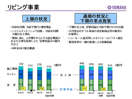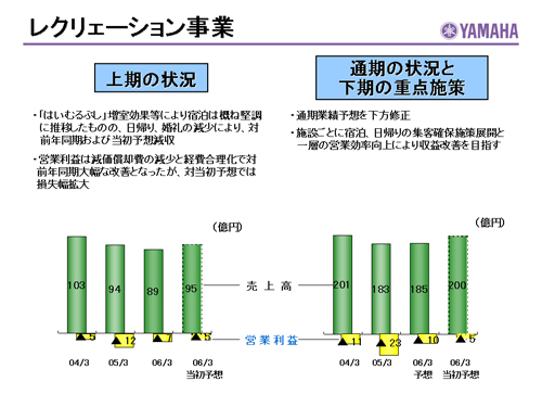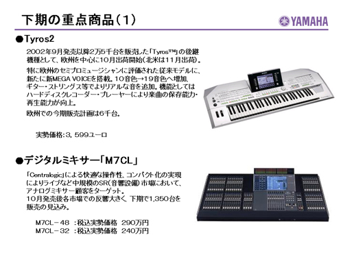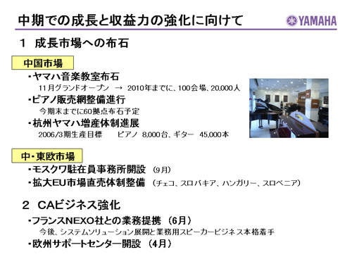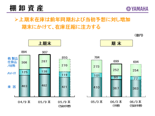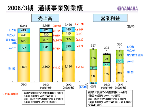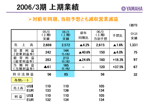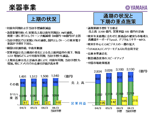この資料の中で、将来の見通しに関する数値につきましては、ヤマハ及びヤマハグループ各社の現時点での入手可能な情報に基いており、この中にはリスクや不確定な要因も含まれております。従いまして、実際の業績は、事業を取り巻く経済環境、需要動向、米ドル、ユーロを中心とする為替動向等により、これらの業績見通しと大きく異なる可能性があります。