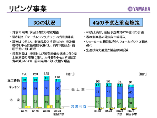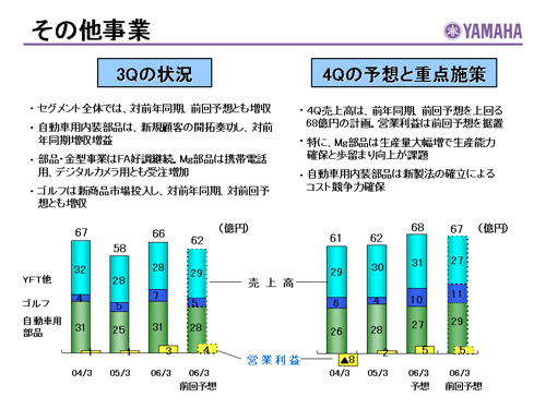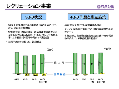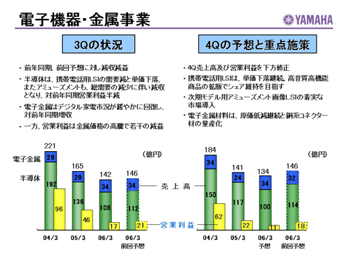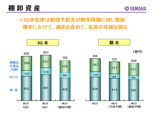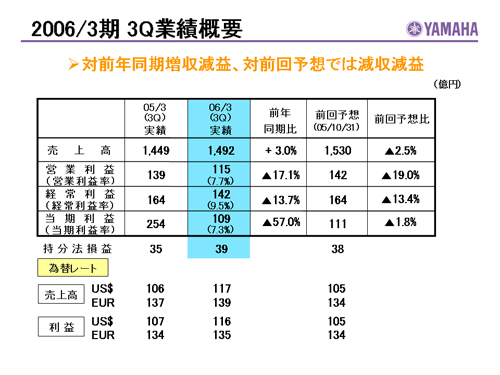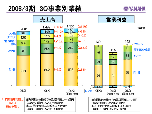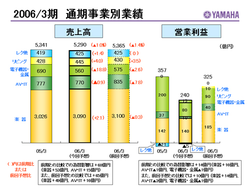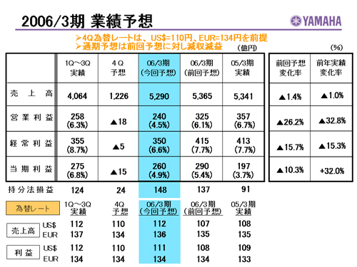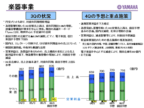 この資料の中で、将来の見通しに関する数値につきましては、ヤマハ及びヤマハグループ各社の現時点での入手可能な情報に基いており、この中にはリスクや不確定な要因も含まれております。従いまして、実際の業績は、事業を取り巻く経済環境、需要動向、米ドル、ユーロを中心とする為替動向等により、これらの業績見通しと大きく異なる可能性があります。