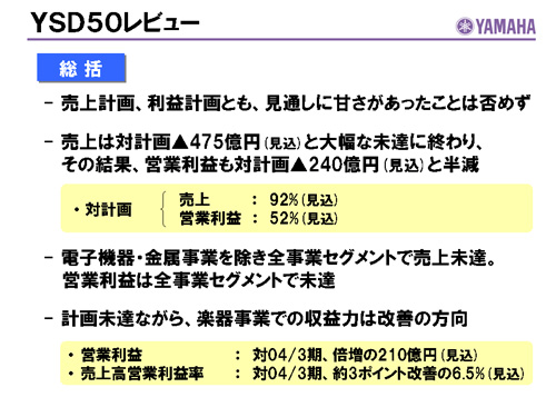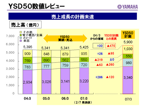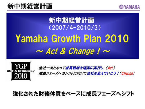 この資料の中で、将来の見通しに関する数値につきましては、ヤマハ及びヤマハグループ各社の現時点での入手可能な情報に基いており、この中にはリスクや不確定な要因も含まれております。従いまして、実際の業績は、事業を取り巻く経済環境、需要動向、米ドル、ユーロを中心とする為替動向等により、これらの業績見通しと大きく異なる可能性があります。