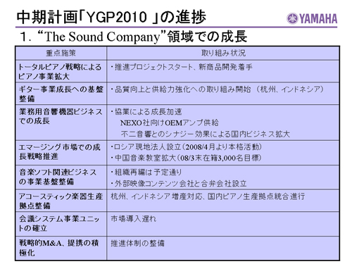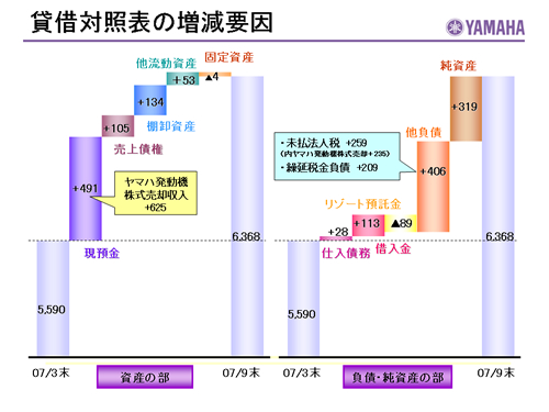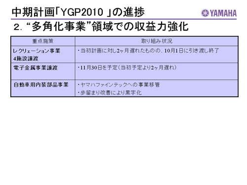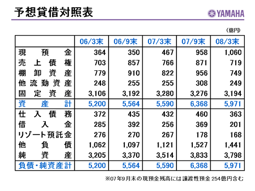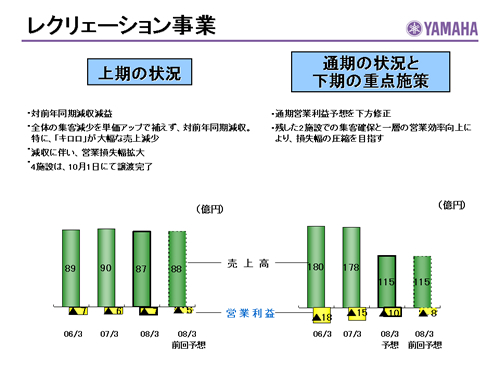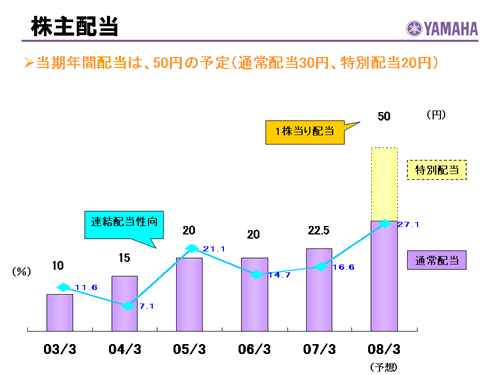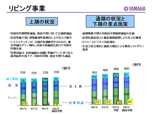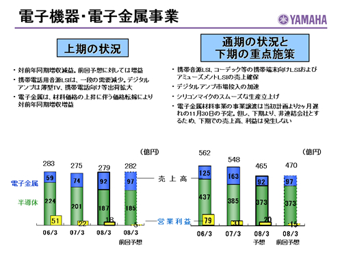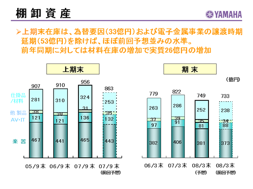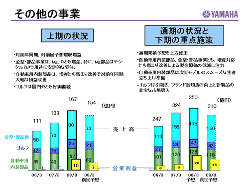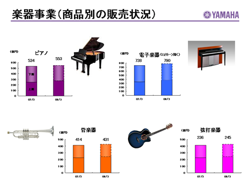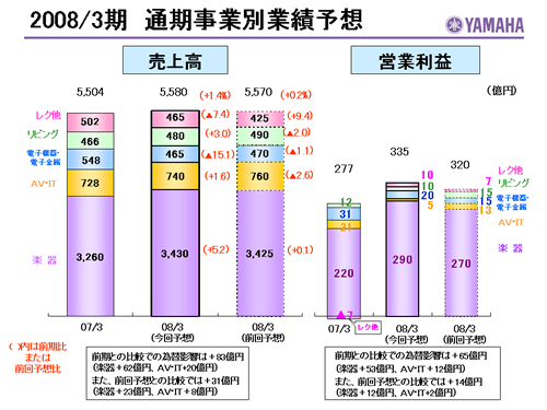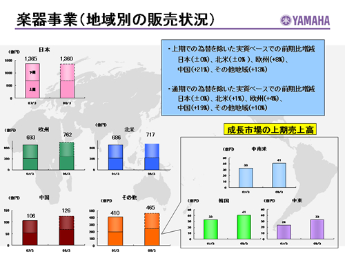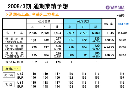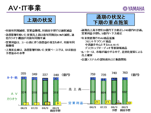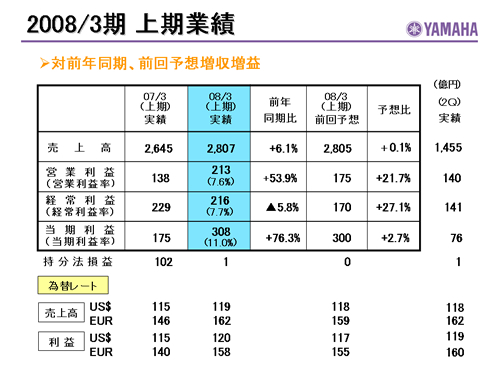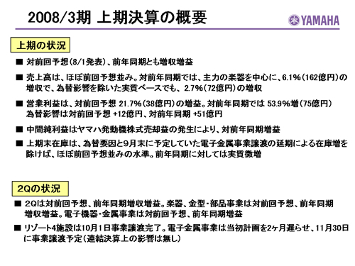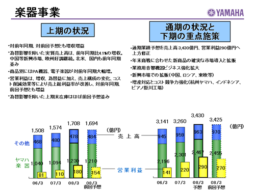 この資料の中で、将来の見通しに関する数値につきましては、ヤマハ及びヤマハグループ各社の現時点での入手可能な情報に基いており、この中にはリスクや不確定な要因も含まれております。従いまして、実際の業績は、事業を取り巻く経済環境、需要動向、米ドル、ユーロを中心とする為替動向等により、これらの業績見通しと大きく異なる可能性があります。