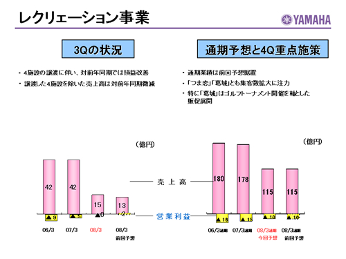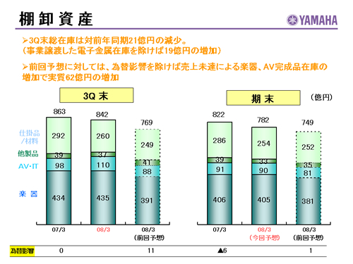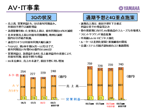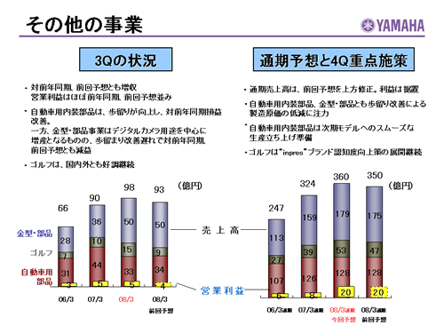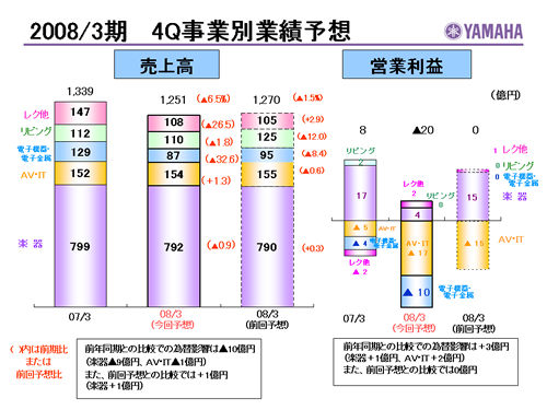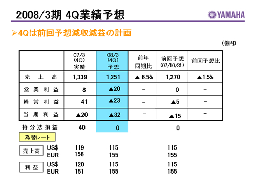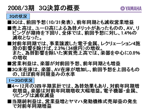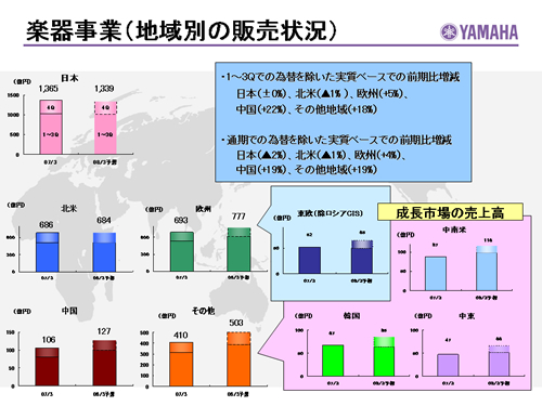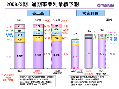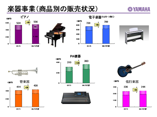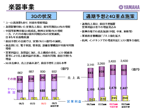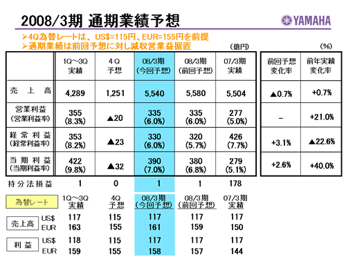 この資料の中で、将来の見通しに関する数値につきましては、ヤマハ及びヤマハグループ各社の現時点での入手可能な情報に基いており、この中にはリスクや不確定な要因も含まれております。従いまして、実際の業績は、事業を取り巻く経済環境、需要動向、米ドル、ユーロを中心とする為替動向等により、これらの業績見通しと大きく異なる可能性があります。