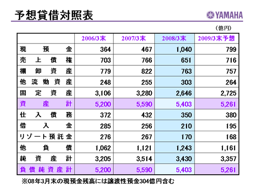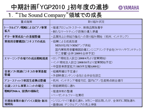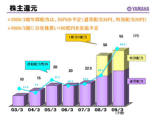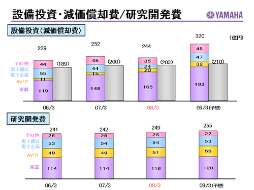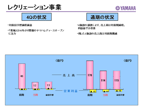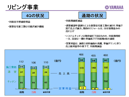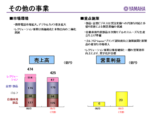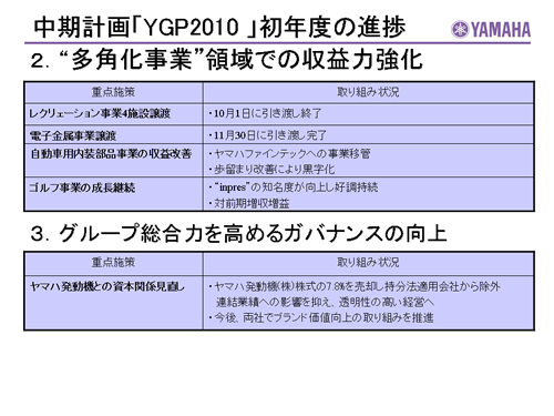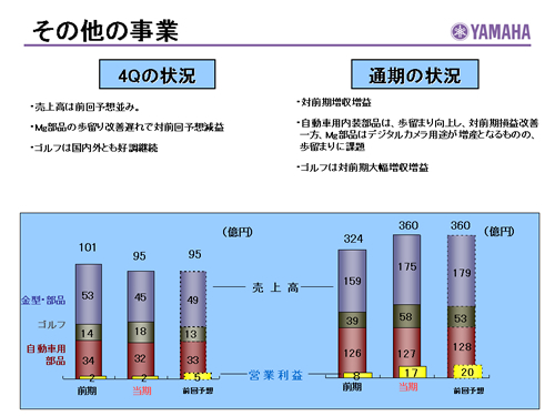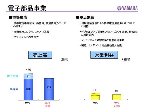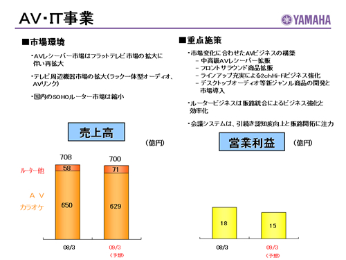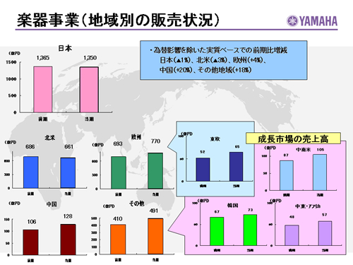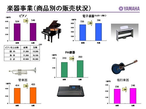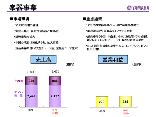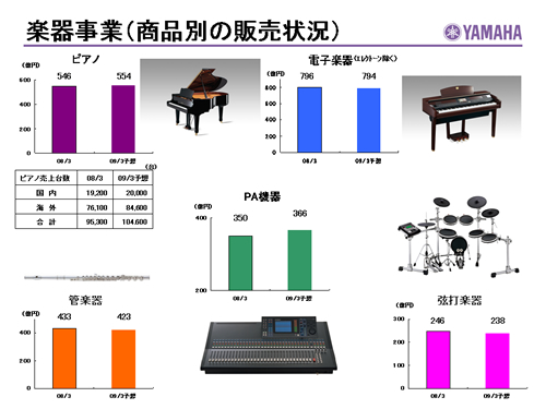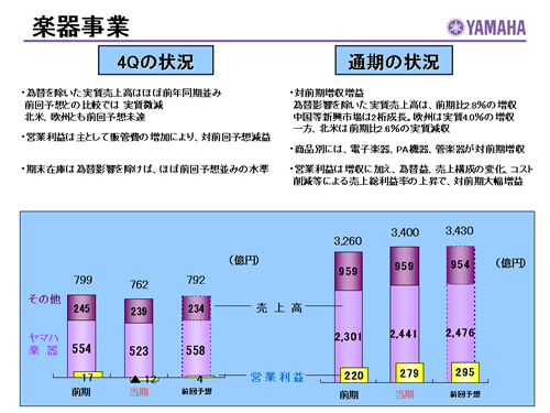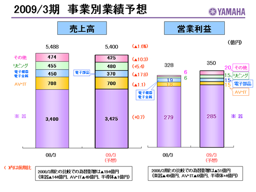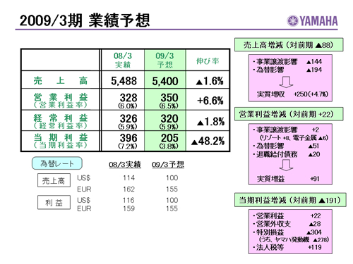 この資料の中で、将来の見通しに関する数値につきましては、ヤマハ及びヤマハグループ各社の現時点での入手可能な情報に基いており、この中にはリスクや不確定な要因も含まれております。従いまして、実際の業績は、事業を取り巻く経済環境、需要動向、米ドル、ユーロを中心とする為替動向等により、これらの業績見通しと大きく異なる可能性があります。