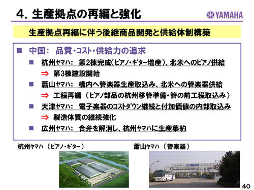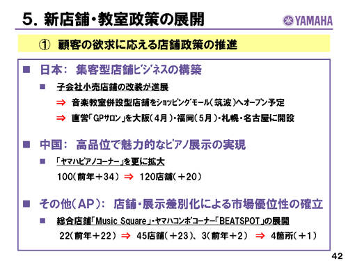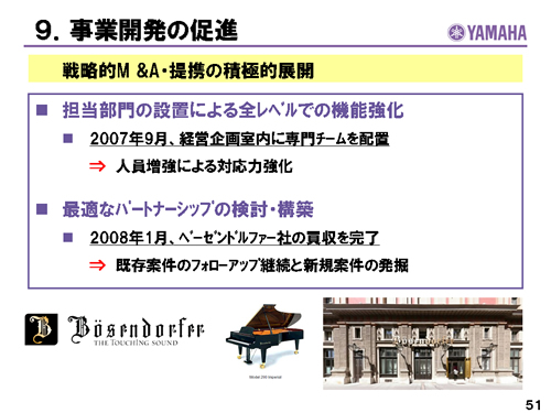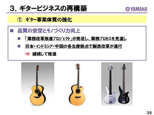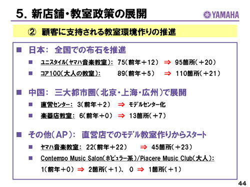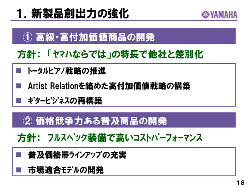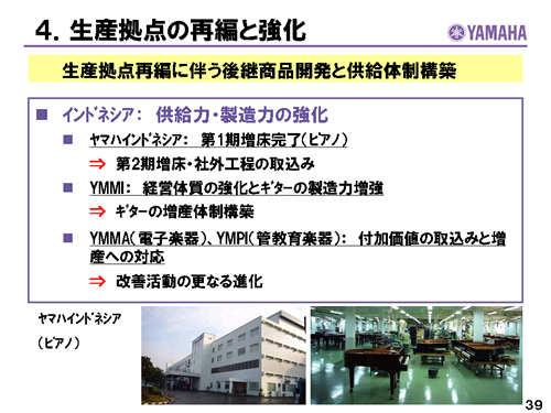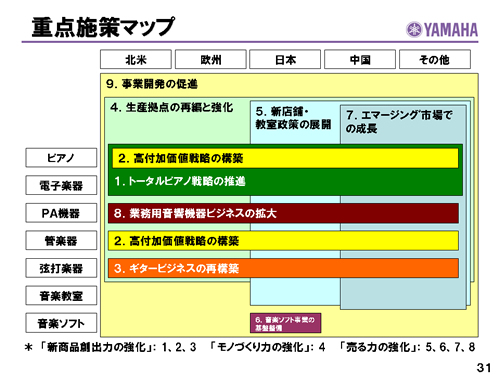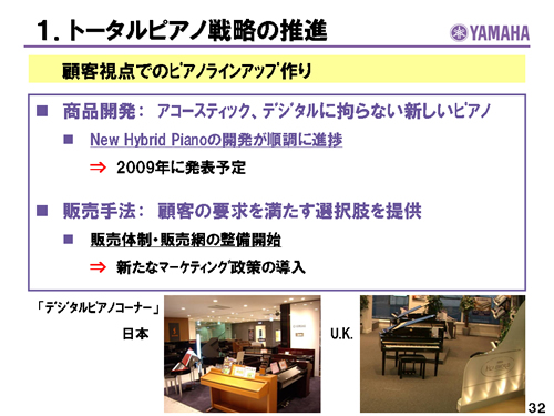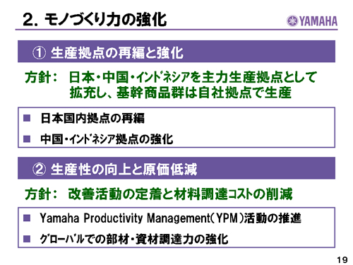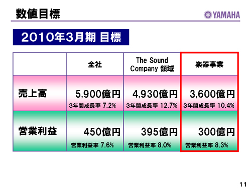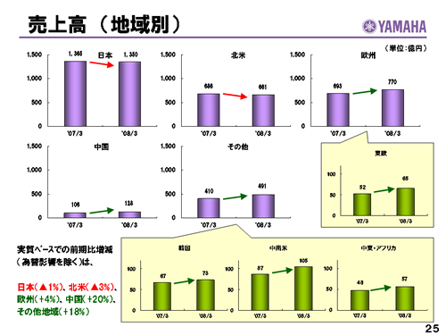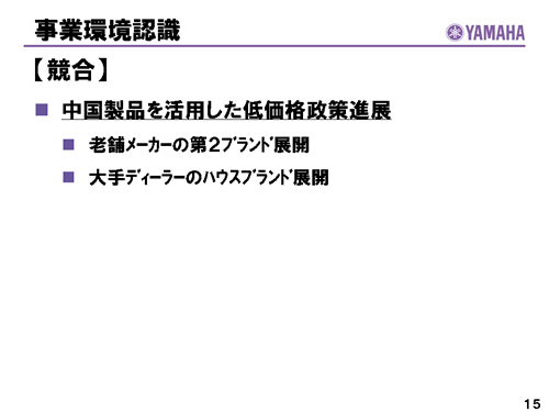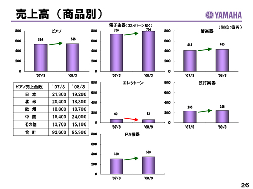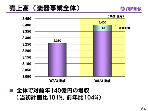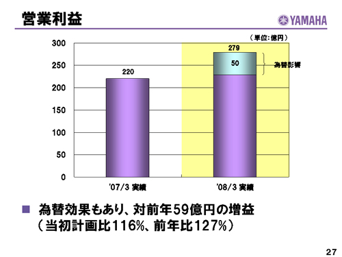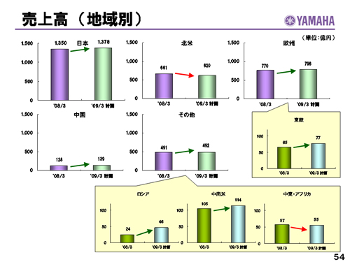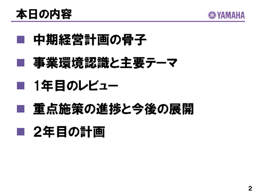 この資料の中で、将来の見通しに関する数値につきましては、ヤマハ及びヤマハグループ各社の現時点での入手可能な情報に基いており、この中にはリスクや不確定な要因も含まれております。従いまして、実際の業績は、事業を取り巻く経済環境、需要動向、米ドル、ユーロを中心とする為替動向等により、これらの業績見通しと大きく異なる可能性があります。