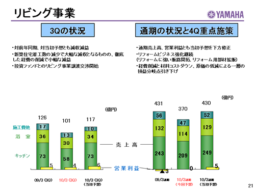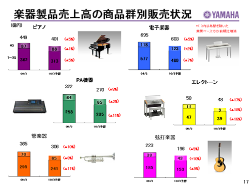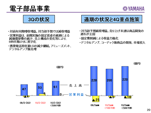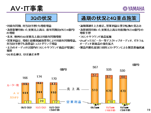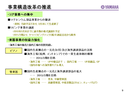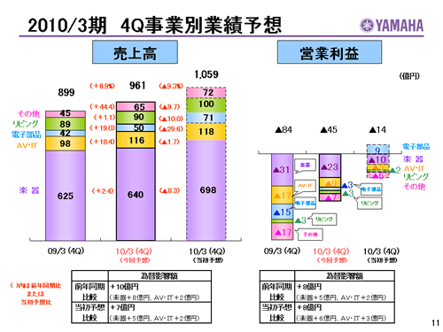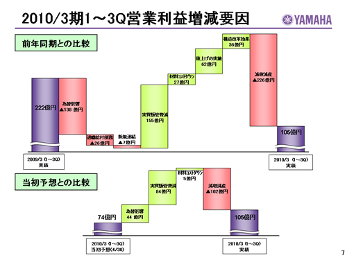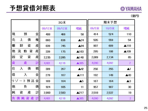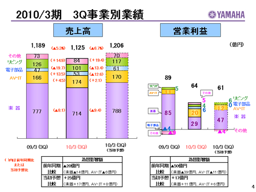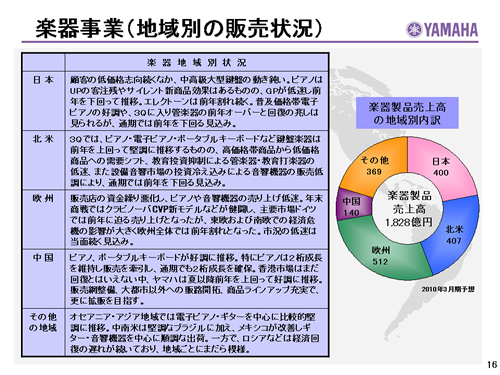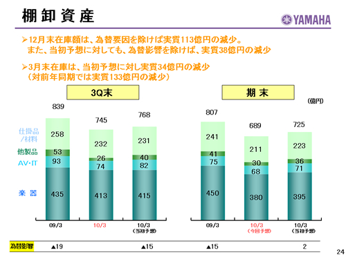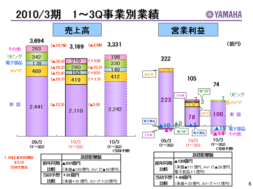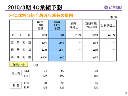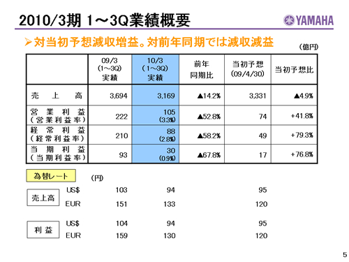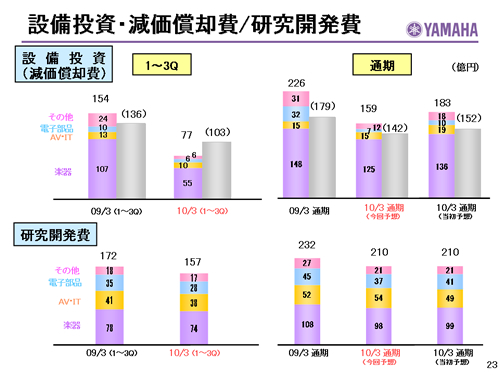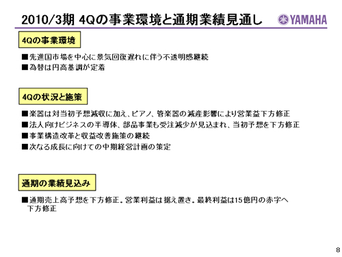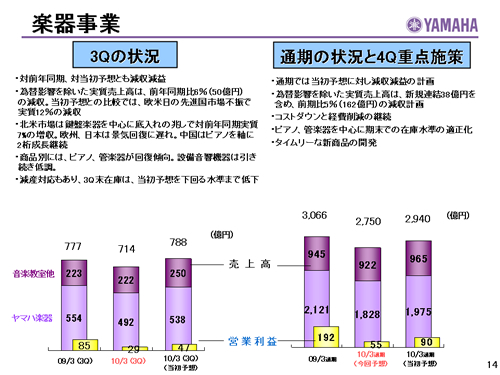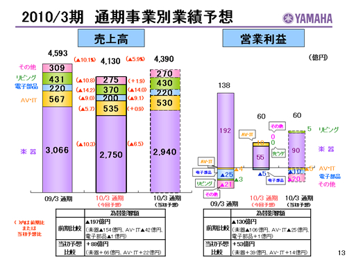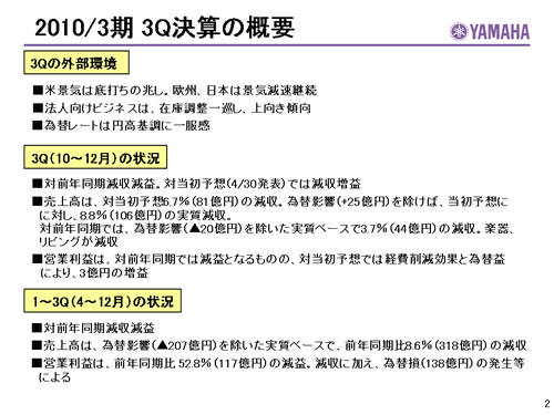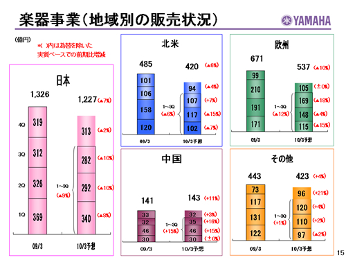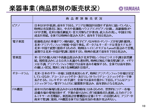 この資料の中で、将来の見通しに関する数値につきましては、ヤマハ及びヤマハグループ各社の現時点での入手可能な情報に基いており、この中にはリスクや不確定な要因も含まれております。従いまして、実際の業績は、事業を取り巻く経済環境、需要動向、米ドル、ユーロを中心とする為替動向等により、これらの業績見通しと大きく異なる可能性があります。