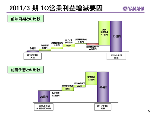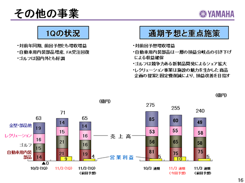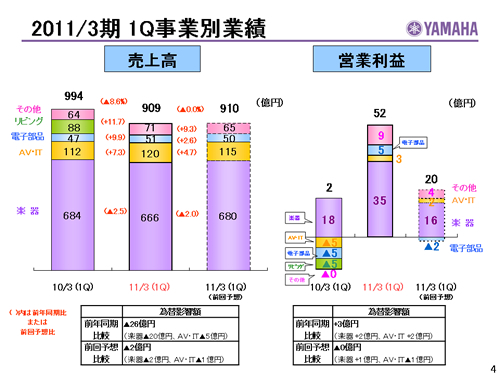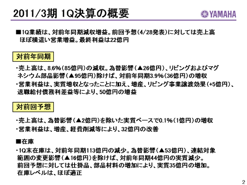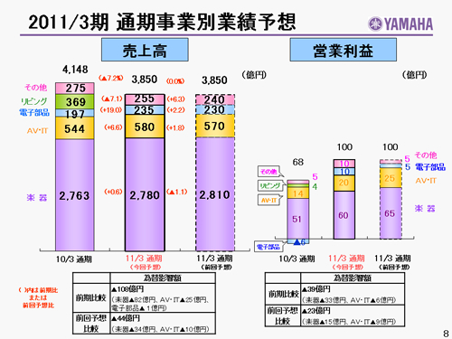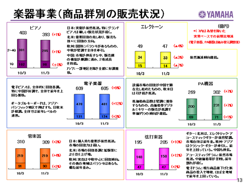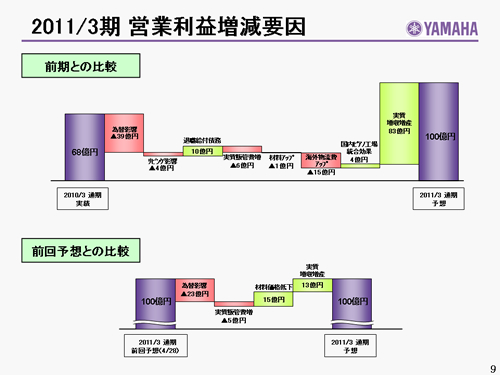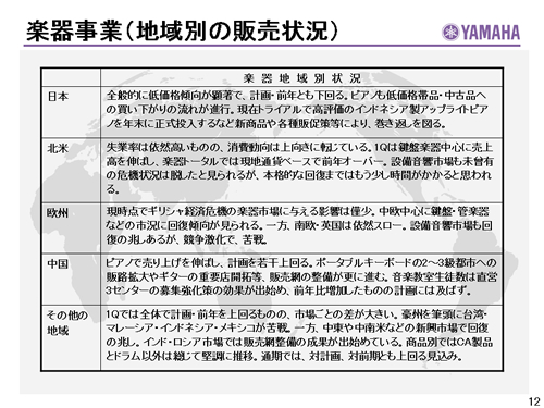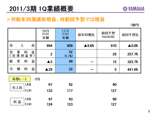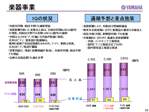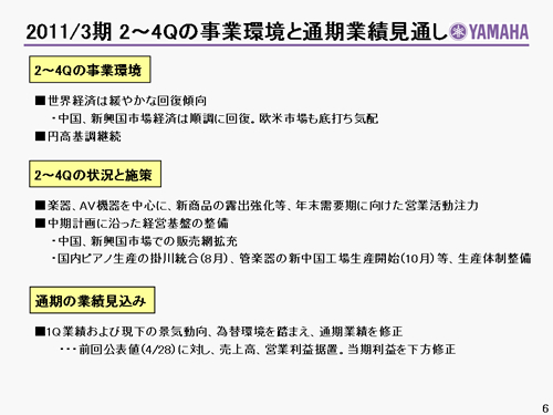 この資料の中で、将来の見通しに関する数値につきましては、ヤマハ及びヤマハグループ各社の現時点での入手可能な情報に基いており、この中にはリスクや不確定な要因も含まれております。従いまして、実際の業績は、事業を取り巻く経済環境、需要動向、米ドル、ユーロを中心とする為替動向等により、これらの業績見通しと大きく異なる可能性があります。
