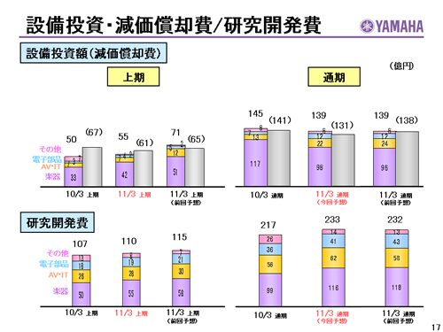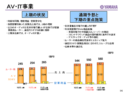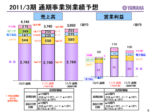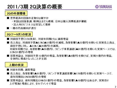 この資料の中で、将来の見通しに関する数値につきましては、ヤマハ及びヤマハグループ各社の現時点での入手可能な情報に基いており、この中にはリスクや不確定な要因も含まれております。従いまして、実際の業績は、事業を取り巻く経済環境、需要動向、米ドル、ユーロを中心とする為替動向等により、これらの業績見通しと大きく異なる可能性があります。