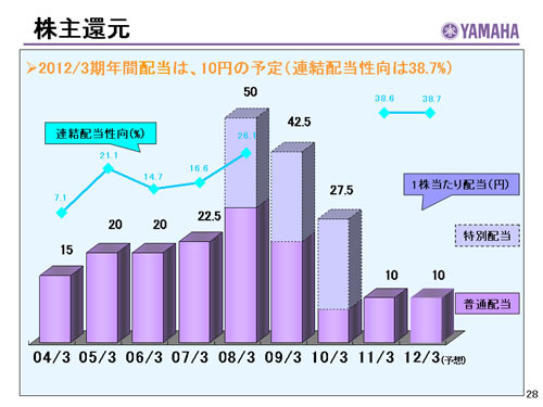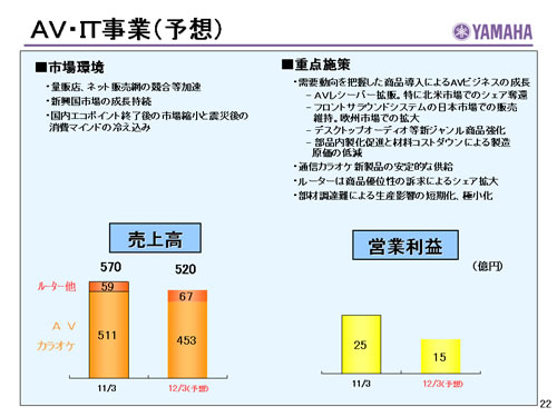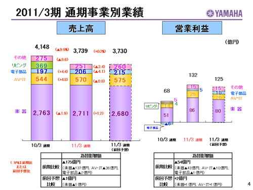 この資料の中で、将来の見通しに関する数値につきましては、ヤマハ及びヤマハグループ各社の現時点での入手可能な情報に基いており、この中にはリスクや不確定な要因も含まれております。従いまして、実際の業績は、事業を取り巻く経済環境、需要動向、米ドル、ユーロを中心とする為替動向等により、これらの業績見通しと大きく異なる可能性があります。