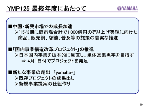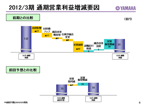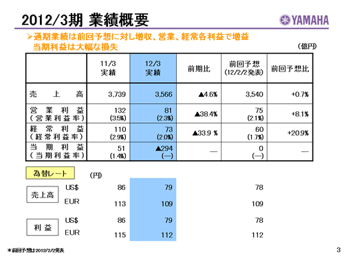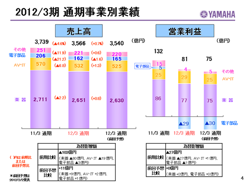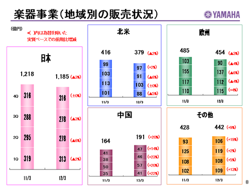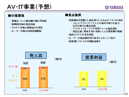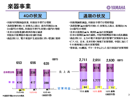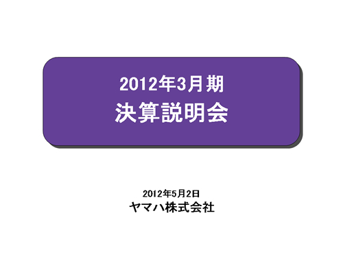 この資料の中で、将来の見通しに関する数値につきましては、ヤマハ及びヤマハグループ各社の現時点での入手可能な情報に基いており、この中にはリスクや不確定な要因も含まれております。従いまして、実際の業績は、事業を取り巻く経済環境、需要動向、米ドル、ユーロを中心とする為替動向等により、これらの業績見通しと大きく異なる可能性があります。
