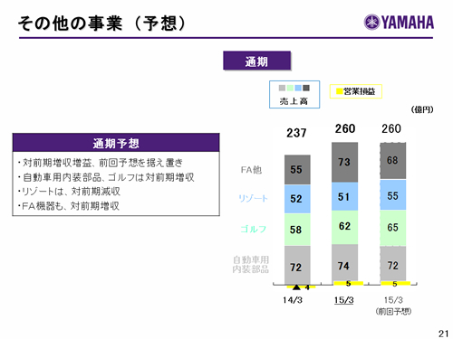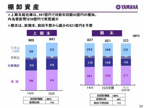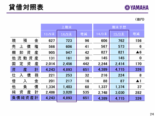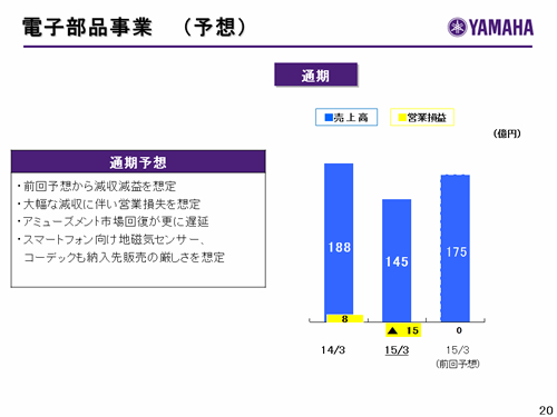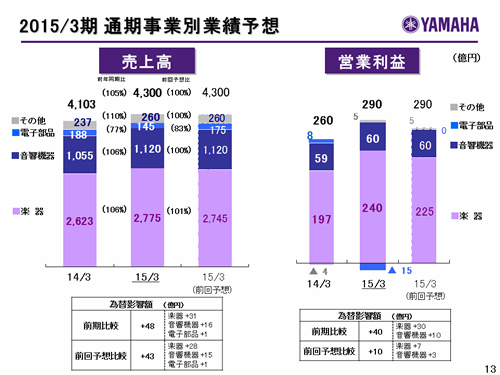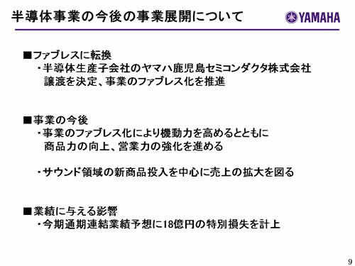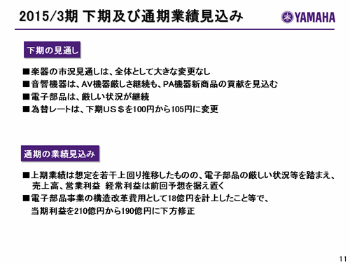 この資料の中で、将来の見通しに関する数値につきましては、ヤマハ及びヤマハグループ各社の現時点での入手可能な情報に基いており、この中にはリスクや不確定な要因も含まれております。従いまして、実際の業績は、事業を取り巻く経済環境、需要動向、米ドル、ユーロを中心とする為替動向等により、これらの業績見通しと大きく異なる可能性があります。