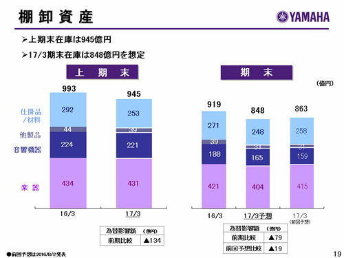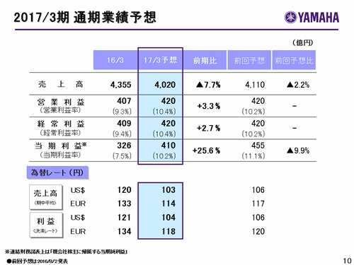 この資料の中で、将来の見通しに関する数値につきましては、ヤマハ及びヤマハグループ各社の現時点での入手可能な情報に基いており、この中にはリスクや不確定な要因も含まれております。従いまして、実際の業績は、事業を取り巻く経済環境、需要動向、米ドル、ユーロを中心とする為替動向等により、これらの業績見通しと大きく異なる可能性があります。