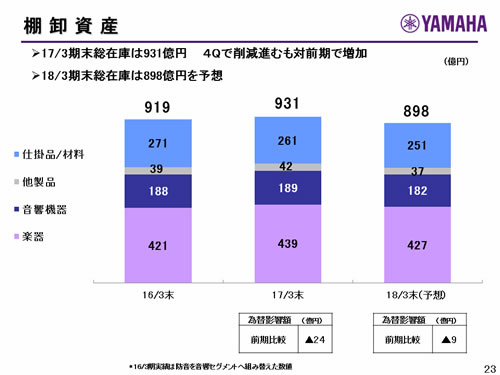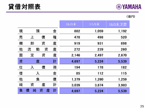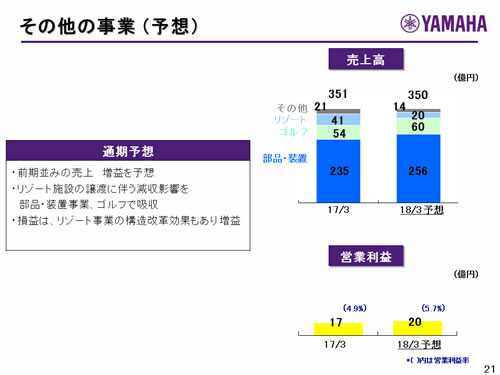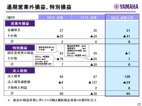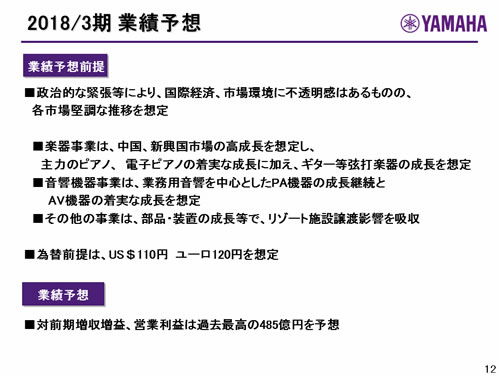 この資料の中で、将来の見通しに関する数値につきましては、ヤマハ及びヤマハグループ各社の現時点での入手可能な情報に基いており、この中にはリスクや不確定な要因も含まれております。従いまして、実際の業績は、事業を取り巻く経済環境、需要動向、米ドル、ユーロを中心とする為替動向等により、これらの業績見通しと大きく異なる可能性があります。