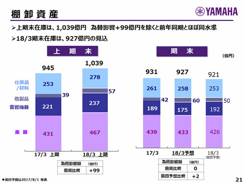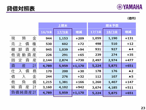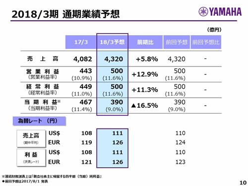この資料の中で、将来の見通しに関する数値につきましては、ヤマハ及びヤマハグループ各社の現時点での入手可能な情報に基いており、この中にはリスクや不確定な要因も含まれております。従いまして、実際の業績は、事業を取り巻く経済環境、需要動向、米ドル、ユーロを中心とする為替動向等により、これらの業績見通しと大きく異なる可能性があります。