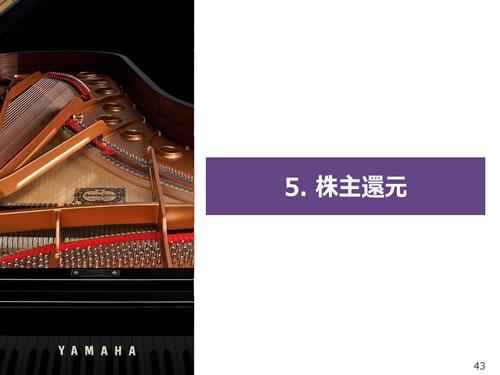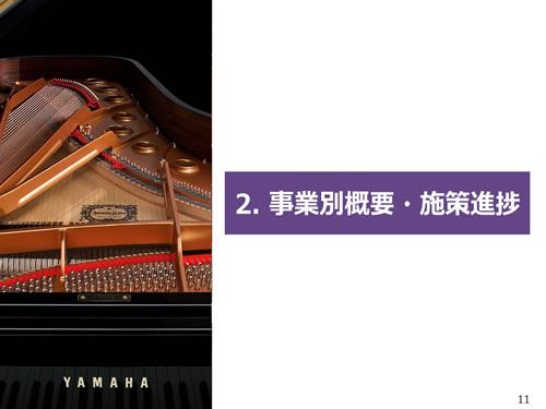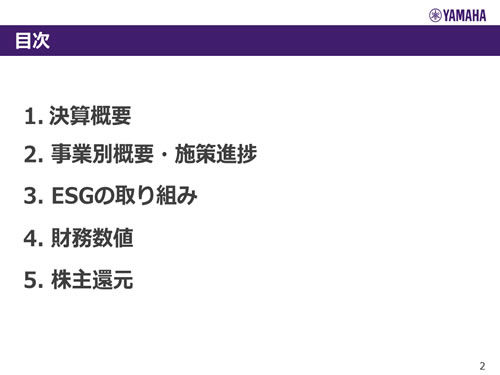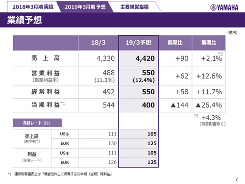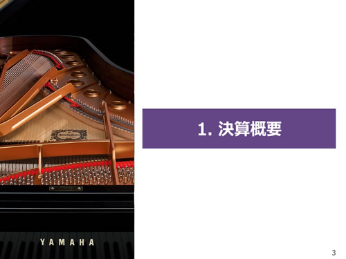 この資料の中で、将来の見通しに関する数値につきましては、ヤマハ及びヤマハグループ各社の現時点での入手可能な情報に基いており、この中にはリスクや不確定な要因も含まれております。従いまして、実際の業績は、事業を取り巻く経済環境、需要動向、米ドル、ユーロを中心とする為替動向等により、これらの業績見通しと大きく異なる可能性があります。