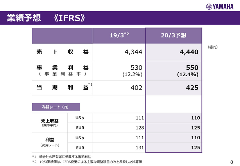 この資料の中で、将来の見通しに関する数値につきましては、ヤマハ及びヤマハグループ各社の現時点での入手可能な情報に基いており、この中にはリスクや不確定な要因も含まれております。従いまして、実際の業績は、事業を取り巻く経済環境、需要動向、米ドル、ユーロを中心とする為替動向等により、これらの業績見通しと大きく異なる可能性があります。