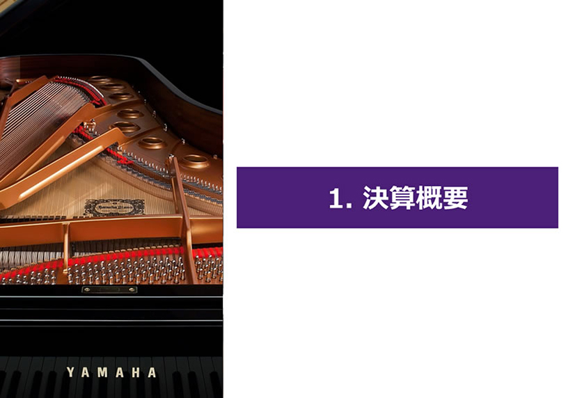 この資料の中で、将来の見通しに関する数値につきましては、ヤマハ及びヤマハグループ各社の現時点での入手可能な情報に基いており、この中にはリスクや不確定な要因も含まれております。従いまして、実際の業績は、事業を取り巻く経済環境、需要動向、米ドル、ユーロを中心とする為替動向等により、これらの業績見通しと大きく異なる可能性があります。