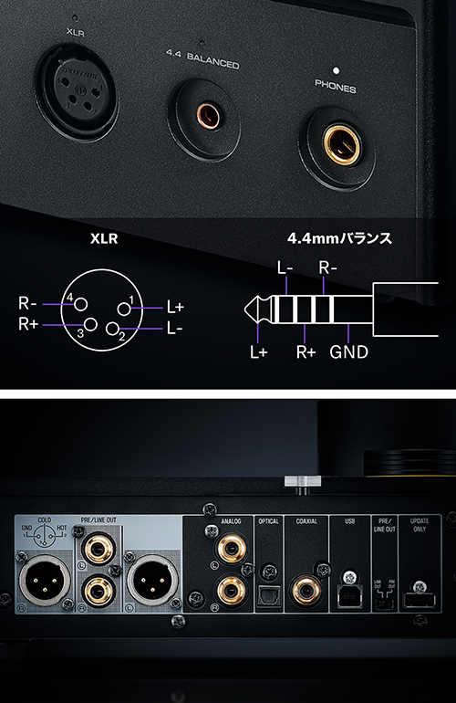 | 音声出力 | ヘッドホン 3(標準 6.3mm×1、バランス 4.4mm×1、XLR 4極×1)、プリアウト/ラインアウト 2(アナログ L/R[RCA]×1、アナログ XLR 3極×1) | |