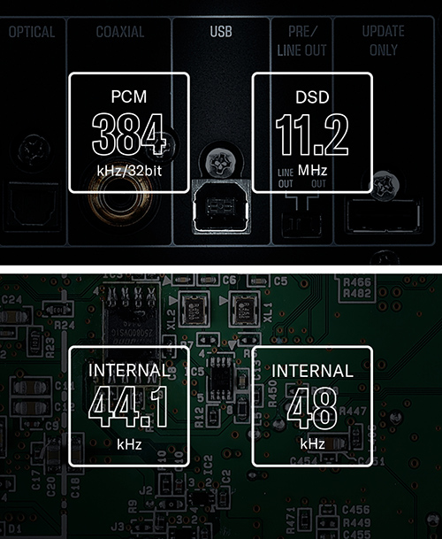PCM 384kHz/32bit、DSD 11.2MHzネイティブ再生に対応。高精度クロックを採用したUSB DAC機能