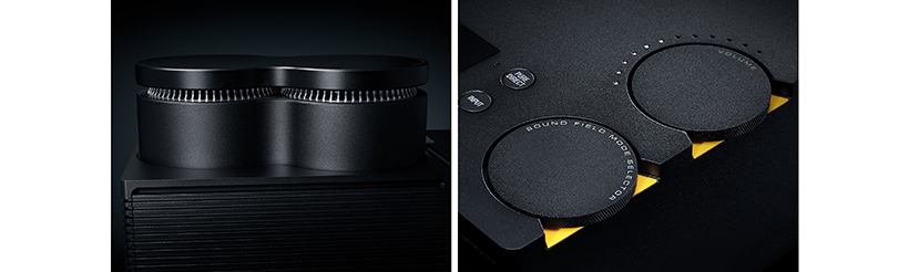 オーディオとしての基本である低重心のボディに2つのトランスを象徴的にマウントした、前衛的なオブジェを感じさせる独創性あふれるデザインを採用しました。さらに縦の立体構造とすることで、トランスの下部に電源基板を配置し電源経路の最短化を図る音質的メリットと外観の美しさを高次元に融合させた構造としています。また重厚感のある肉厚なアルミパーツで構成され精緻に組み上げられた本体に加え、マスターボリュームやモードセレクターのダイヤルにも高品位なアルミ素材を使用したうえ、サンドブラスト加工を施すことで上質な質感を演出し、細部に至るまでハイエンドオーディオとしての品位と所有する歓び、使う歓びを追求しました。