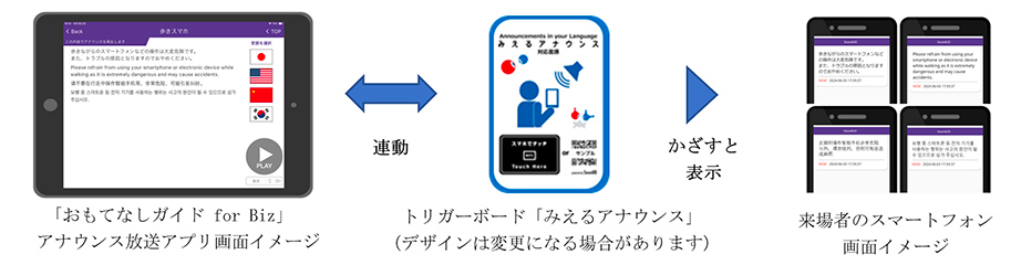 会期中は、運営事務局が場内放送の補助ツールとして「おもてなしガイド for Biz」の多言語アナウンスシステムを使用し、イベント案内、パビリオン紹介、緊急時の放送などを多言語で行います。また、多言語翻訳ソフトを活用し、アナウンス者の肉声で多言語放送することができます。来場者は、会場内に設置される「みえるアナウンス」のトリガーボードのQRコードやNFCタグを通じてWebサイトにアクセスし、専用アプリ不要でアナウンスの内容を自身のスマートフォンに設定された言語で読むことができます。