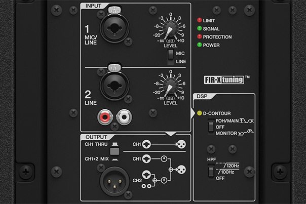 『DHR15M』『DHR12』は、2つの入力チャンネルを備えています。CH1は、XLRとTRSフォーンのコンボジャックを備え、マイクやライン入力信号のどちらも入力が可能です。CH2はXLRとTRSフォーンのコンボジャックの他にCDプレーヤーのようなステレオラインレベルの入力ソース用にRCAピンジャックを備えています。また、内蔵のミキサー機能により、CH1とCH2をミックスする「CH1+2MIX」と信号をCH1のみに制限する「CH1 THRU」を選択できます。