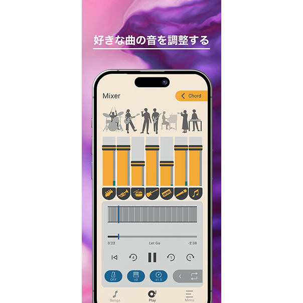 - 各パートの音量を自由に調整し、「自分が演奏する楽器の音だけを聴いて耳コピをする」、「自分が演奏する楽器の音をミュートして他のパートと一緒に演奏する」、「ドラムを強調してリズムを掴みやすくする」など状況に応じた柔軟な練習が可能