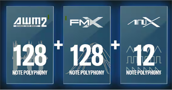 音源システムの核となる「ハイブリッド音源」には、「MONTAGE Mシリーズ」と同じサウンドエンジンである、アコースティック楽器からシンセサウンドまで原音の高い再現性と自然で豊かな表現を得意とした「AWM2」音源(最大128音ポリフォニック)と、滑らかでダイナミックな音変化を得意とする「FM-X」音源(最大128音ポリフォニック)を搭載。さらに、アナログシンセサイザーの微細な振る舞いまでをすべてデジタルで完全再現したバーチャルアナログ音源「AN-X」(最大12音ポリフォニック)を新たに搭載したことで、従来モデル以上に独創的な音作りとダイナミックな演奏が可能になりました。