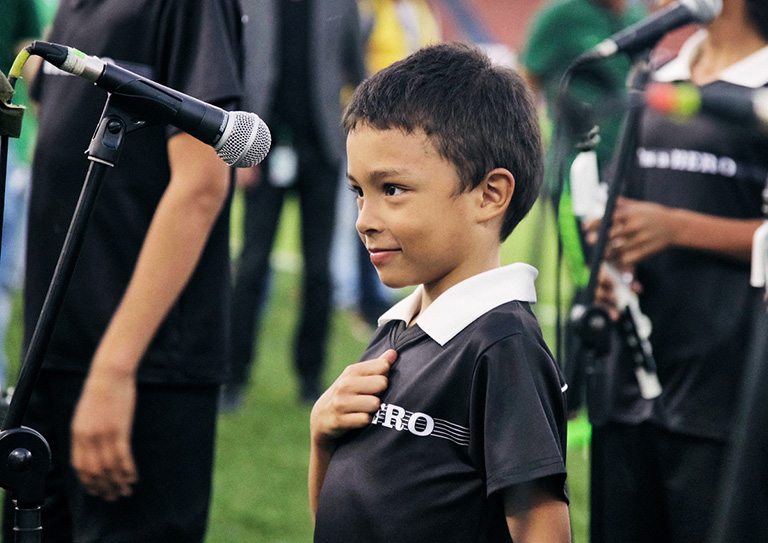 こうした「見えない壁」に立ち向かう子どもたちが主役となるのが『I’m a HERO Program』です。今回プログラムに参加したのはコロンビア・メデジン市で暮らす26名の子どもたちで、彼らはこれまで演奏したことのない「Venova」の演奏技術の習得と国歌演奏の練習に熱心に取り組み、今年3月から約半年に渡る練習を得て、9月30日(日)に開催されたコロンビア国内サッカー一部リーグの一節で、地元クラブチーム「アトレティコ・ナシオナル」の選手とともにフィールドに入場し、大観衆の前で国歌演奏を披露しました。