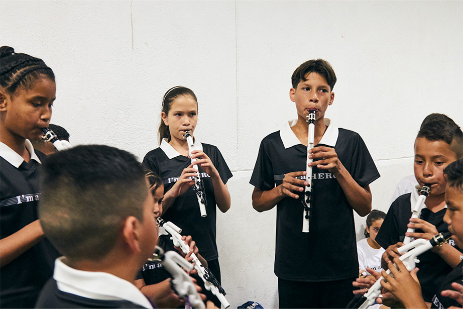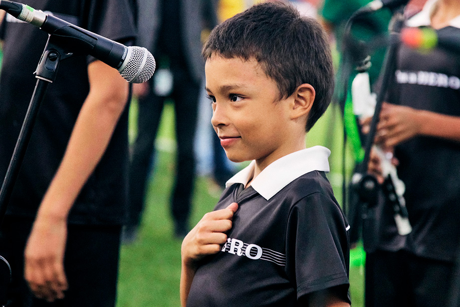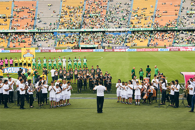 子どもたちは、これまでリコーダー以外の管楽器演奏経験は無く、今回の舞台にむけてそれぞれの指導者のもとで、Venovaの演奏修得に約6ヶ月間かけて取り組みました。その後、現地時間2018年9月30日(日)に開催されたコロンビア国内一部リーグである「カテゴリア・プリメーラA」の一節に出場する同国のサッカークラブ「アトレティコ・ナシオナル」の選手とともにフィールドに立ち、同国の青少年バンド「Banda Sinfónica de Copacabana」の子どもたちによる伴奏とともに、大観衆の前で国歌演奏を披露しました。