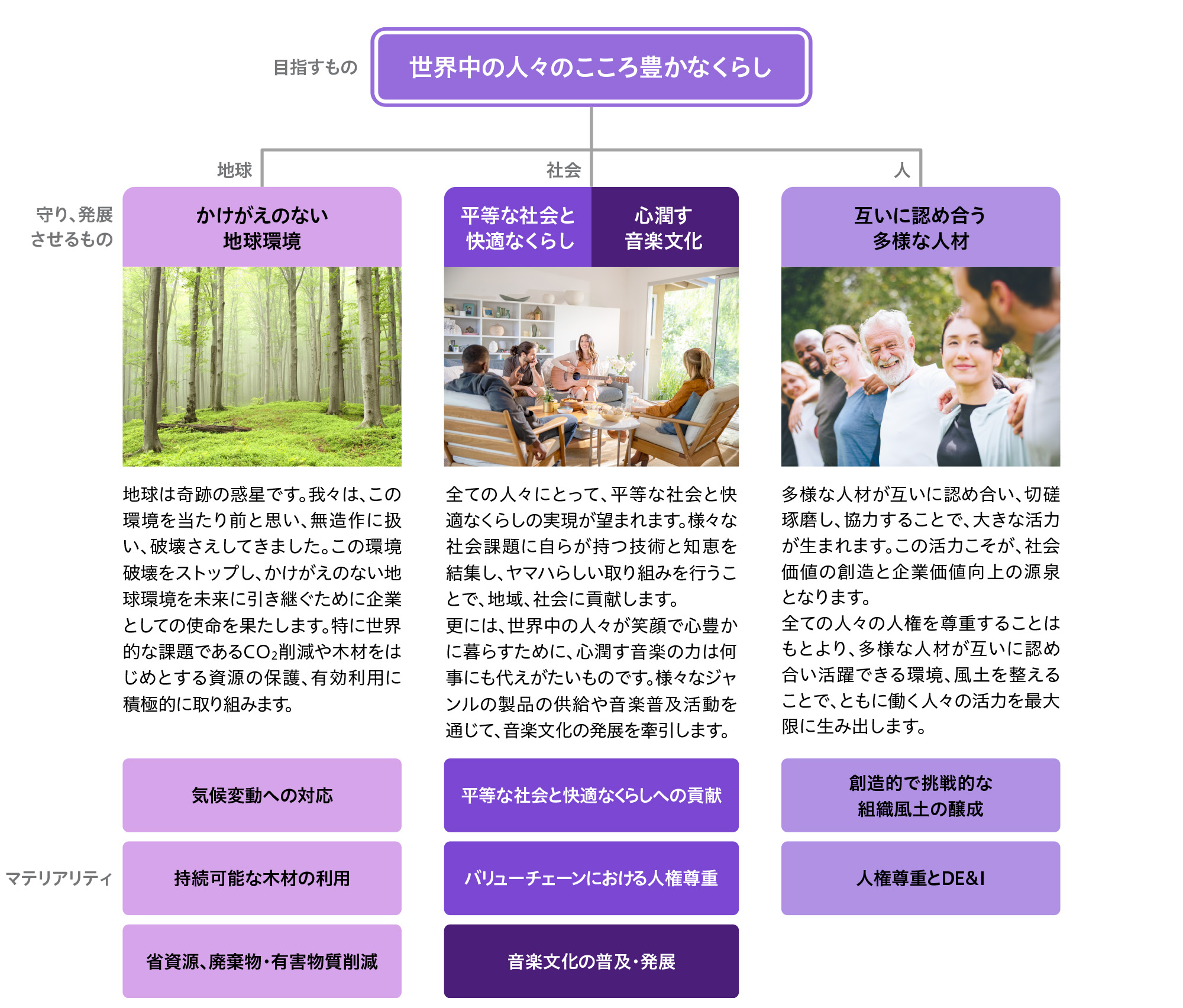 ヤマハグループは、世界中の全ての人々が心豊かに暮らす社会を目指します。その実現のために、企業理念である「ヤマハフィロソフィー」を心のよりどころに、かけがえのない地球環境を守り、平等な社会と快適なくらし、心潤す音楽文化の発展に貢献するとともに、人権尊重はもとより、多様な人材が互いに認め合い活躍できる環境を整えることで、未来に向かって新たな感動と豊かな文化を世界の人々とともに創りつづけます。