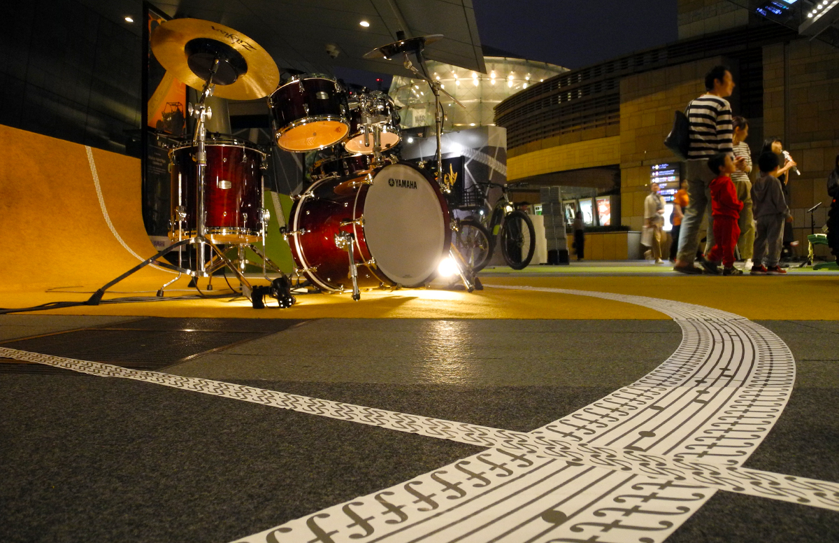 Track=軌道を意味し、"トラックレース"や"サウンドトラック"など、乗りものや音楽の世界でも広く使われます。今回の展示では両社にとっての"Tracks"を、轍(乗り物の軌道)や楽譜に象徴し、重なり織り交ぜあいながら、両社共通で思い描く理想の時間やシーンを表現します。