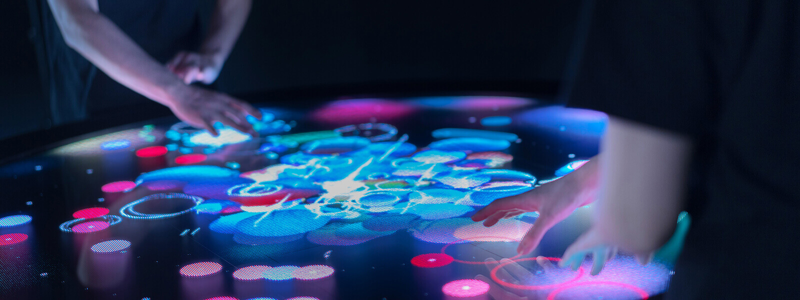 2名のプレーヤーがペアとなって非言語的かつ直感的な意思伝達を繰り返しながら体験するインスタレーションです。各プレーヤーは円卓状のタッチスクリーンにNoteと呼ばれる目印を作り出して相手にリズムパターンを送りつつ、相手から送られてきたNoteに触れることでTone(音)を生み出し、相手が作ったリズムパターンを奏でます。科学とアートを融合させた独自の研究成果に基づき、非言語的で直観的なコミュニケーションによって感情の揺れを人工的に発生させることで、ジャズの即興演奏のような人と人の「一体感」、あるいは、人が楽器やオートバイに対して感じる「一体感」と、そこから生まれる感動を疑似体験できる研究プロトタイプです。