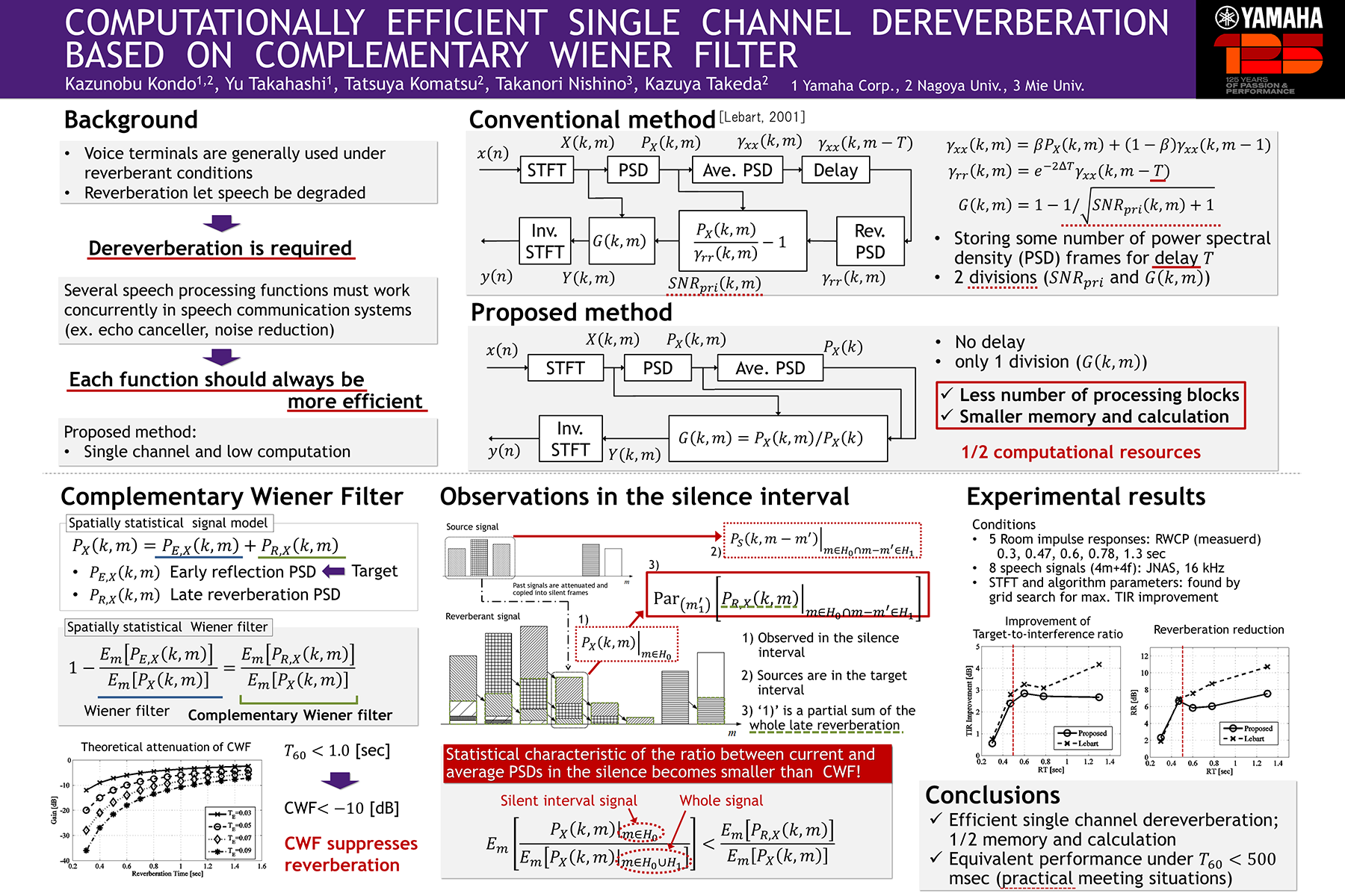 研究者としての活動では、国内、国際を問わず学会で発表したり、また国際会議文献やジャーナルの査読、Journal of Audio Engineering Societyの論文編集委員を依頼されたりしています。加えて、専門家としての目利きも買われ、国際会議のスポンサー代表として学会へ参加しつつ、様々な研究者との交流を進め人材獲得の手助けもしています。経歴の途中で社会人博士課程へ進学し、名古屋大学にて情報科学博士の学位を授与されました。これに関わり2013年には「ICASSP (IEEE International Conference on Acoustics, Speech and Signal Processing)」にて音源分離のポスター発表をしています。